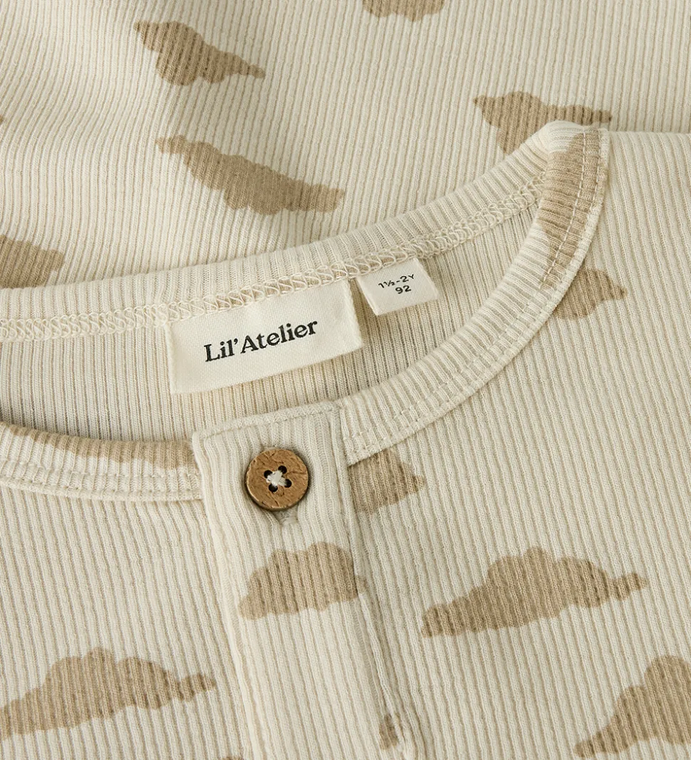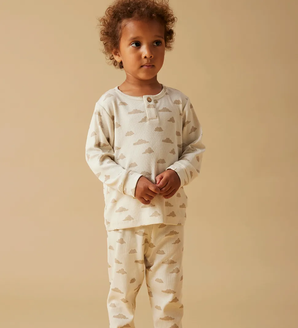 Dejligt Lil Atelier nattøj bestående af en natbluse med lange ærmer og et par natbukser med elastisk talje, som sikrer en god pasform. Nattøjet er prydet med et gennemgående print af skyer, som giver et charmerende udtryk.