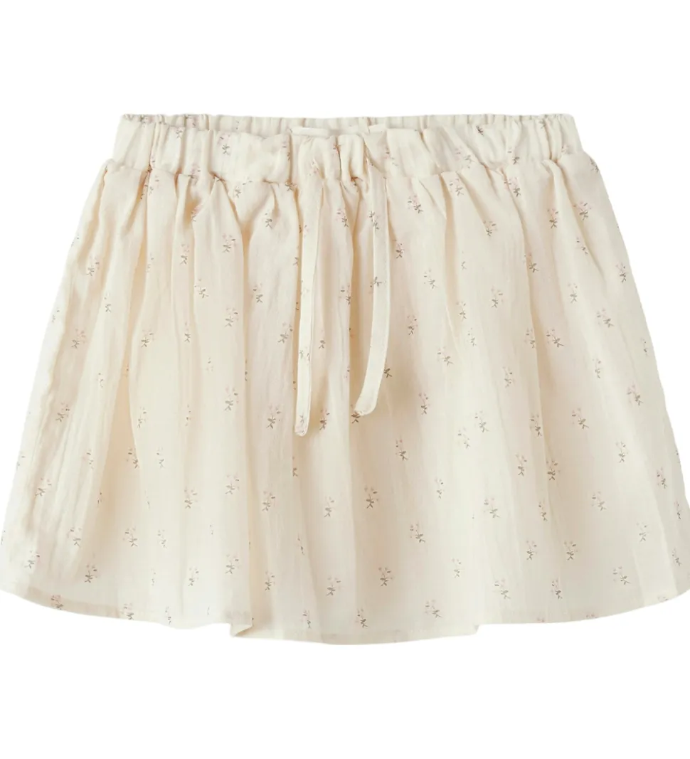 Elegant Lil Atelier nederdel i lys beige med et alloverprint af små blomster i rosa og grønne nuancer. Lil Atelier nederdelen har en løs pasform og elastisk talje, som kan justeres med knapper indvendigt. Nederdelen består af to lag og fortil er der dekorative snøre.