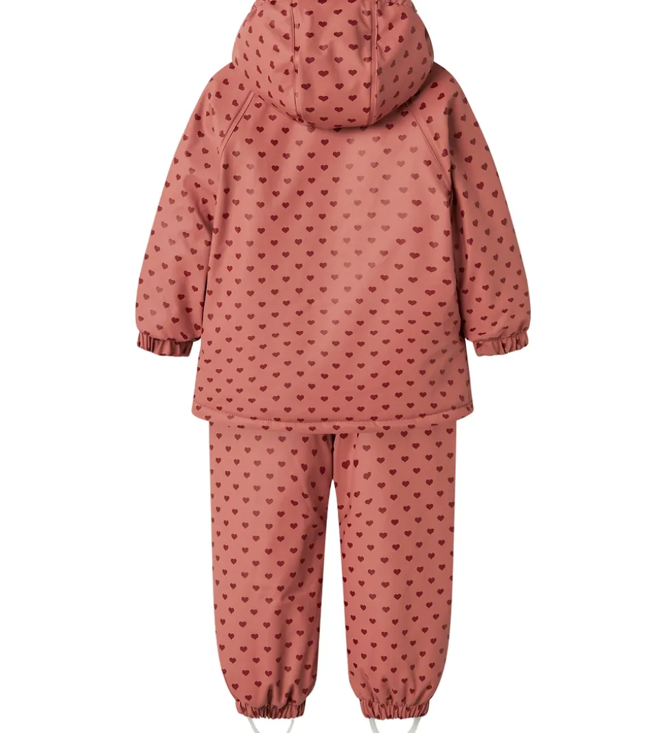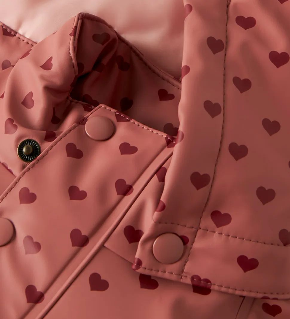 Sødt Lil’ Atelier regntøj i mørk, støvet rosa og med et alloverprint af hjerter.