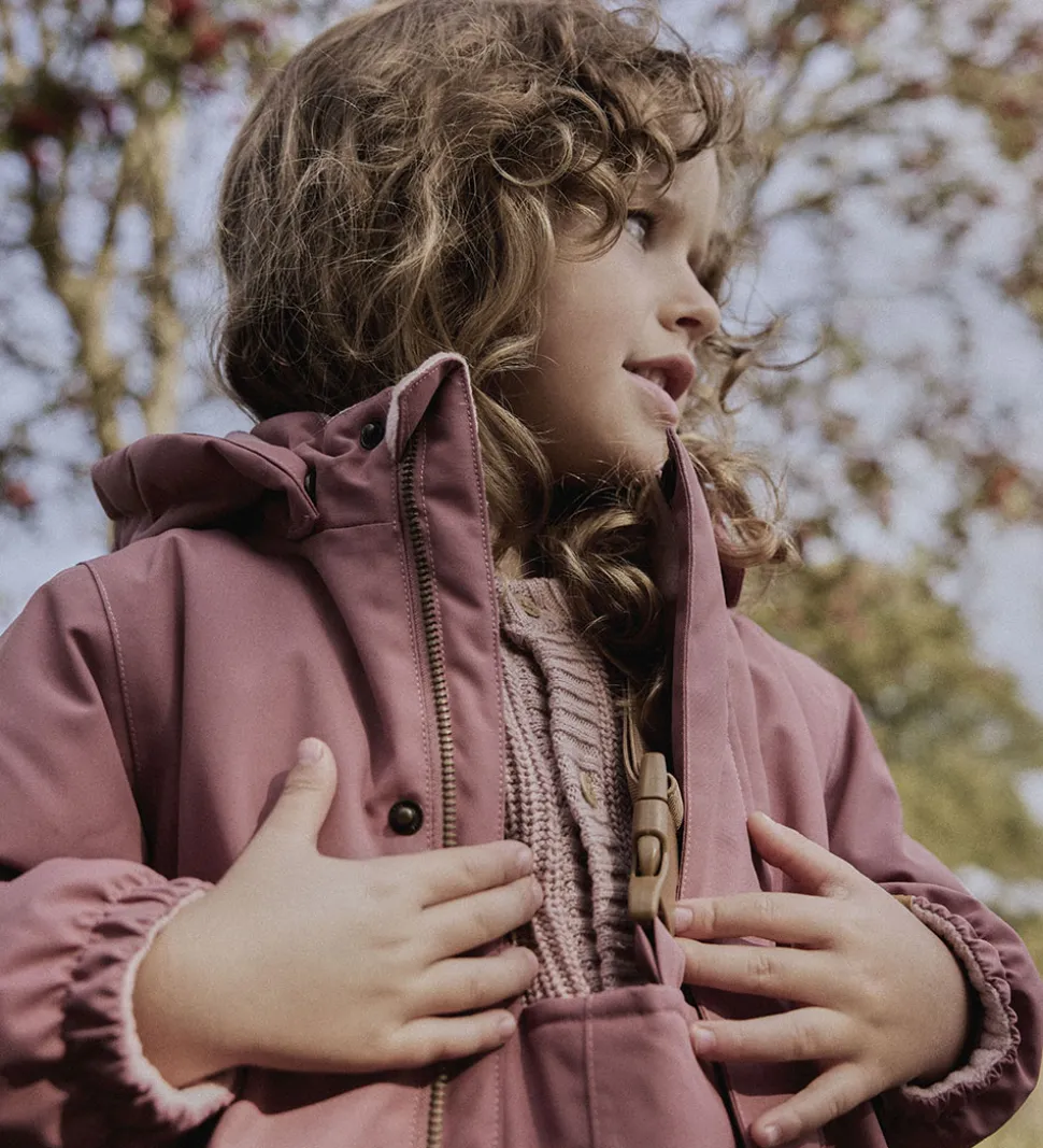 Lil’ Atelier vinterjakken har en aftagelig hætte med trykknapper, og en skjult elastikkant med fleece-for i åbningen, så den sidder tæt om ansigtet. Flyverdragten har en lynlåsåbning med dobbelt vindstolpe, som lukkes til med velcro. Vinterjakken har et blødt fleece-for i kroppen, og den er lunt vatteret.