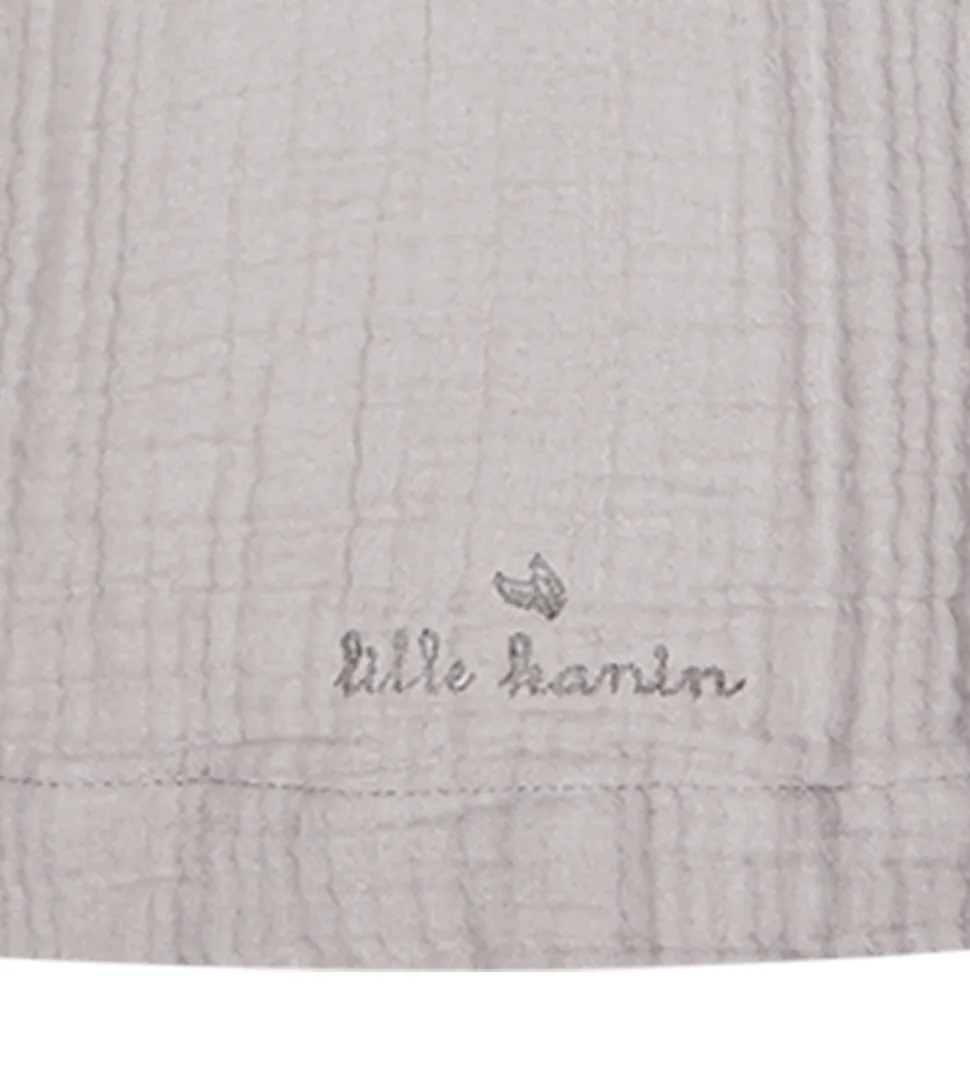 Lille Kanin badekåben er i blødt musselin og har lange ærmer og en fast hætte, og den lukkes til med et bindebånd omkring taljen.