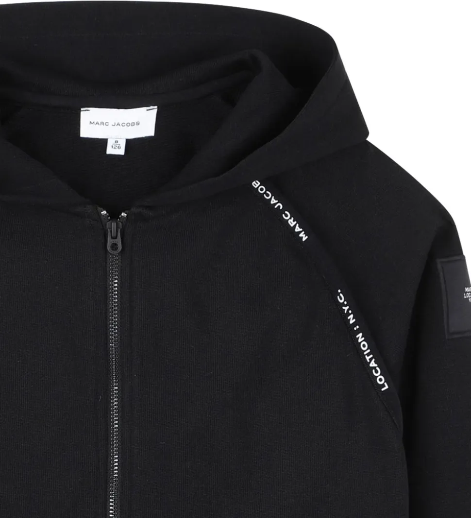 Stilfuld Little Marc Jacobs cardigan i sort sweat, og foran skuldrene er der hvide logostriber. Little Marc Jacobs cardiganen har en hætte med bomuldsfor, og den har brede ribkanter. Cardiganen åbnes med en lynlås, og fortil sidder der store, praktiske lommer.