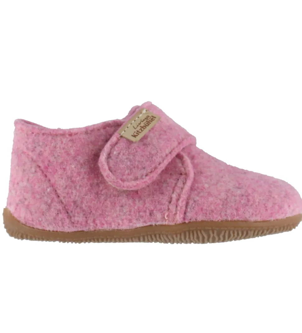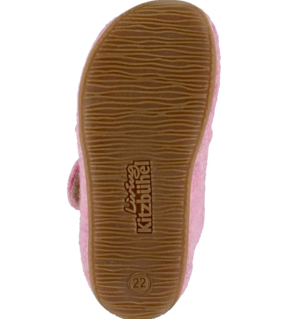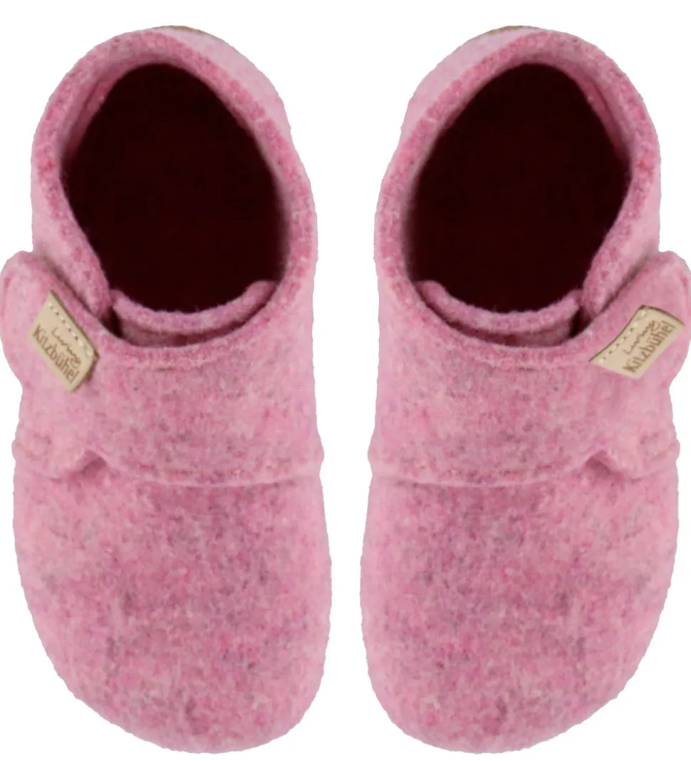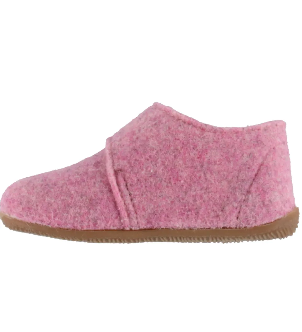 Fine Living Kitzbühel hjemmesko i rosa filtet uld, med et lille logo-patch på velcroremmen.