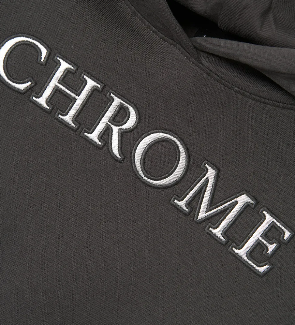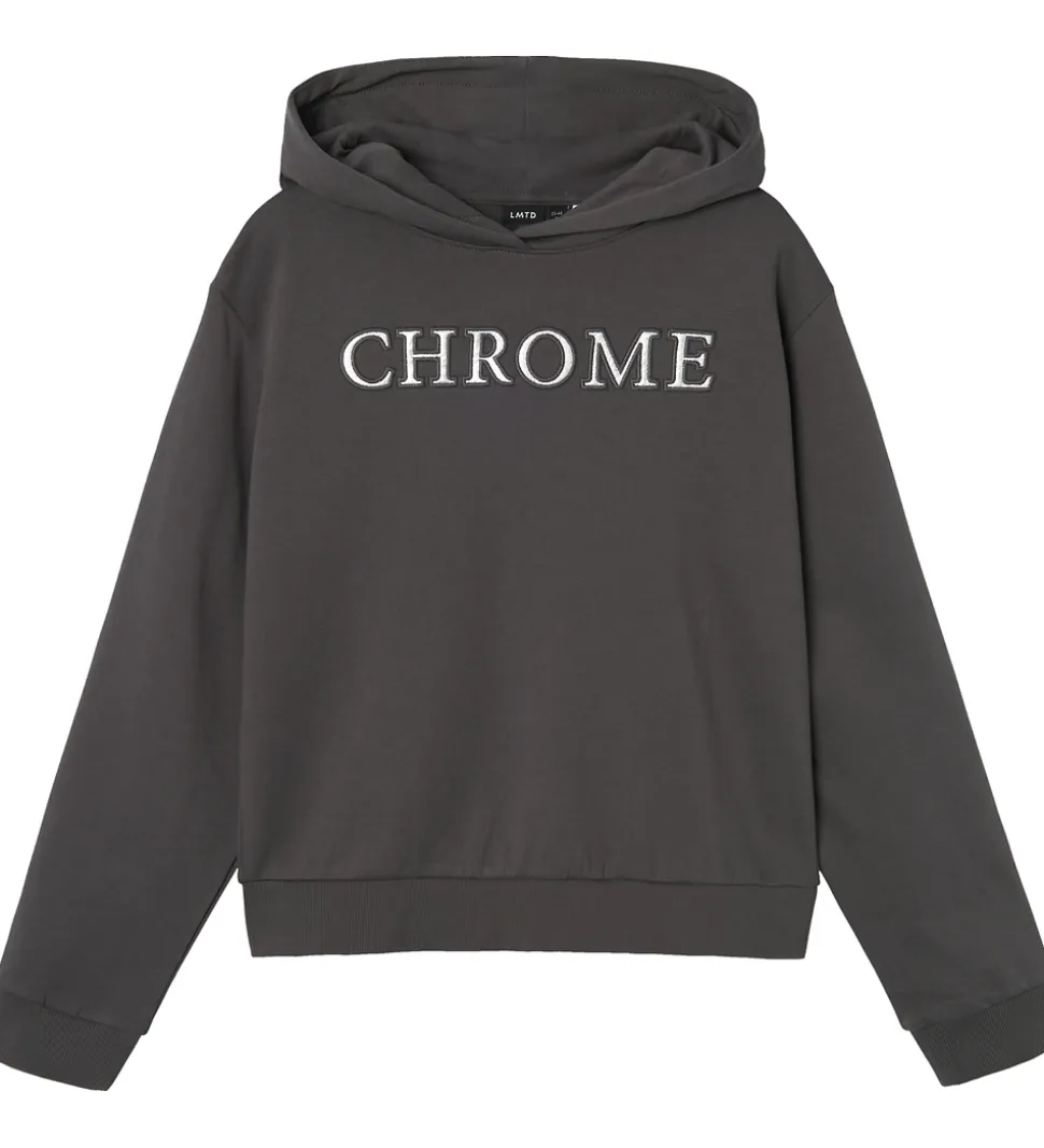 Flot LMTD hættetrøje i en stilren, mørkegrå nuance med teksten “CHROME” broderet på fronten. LMTD hættetrøjen har lange ærmer og en klassisk hætte. Ribkanter ved håndleddene og forneden sikrer en god pasform.