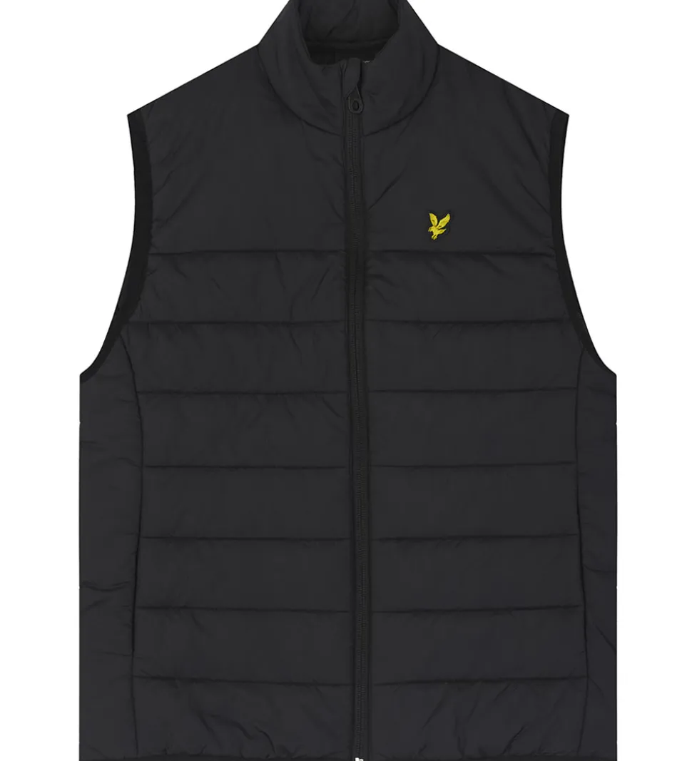 Lækker Lyle & Scott dynevest i sort i en glatvævet kvalitet og med et lille, gult logo fortil.