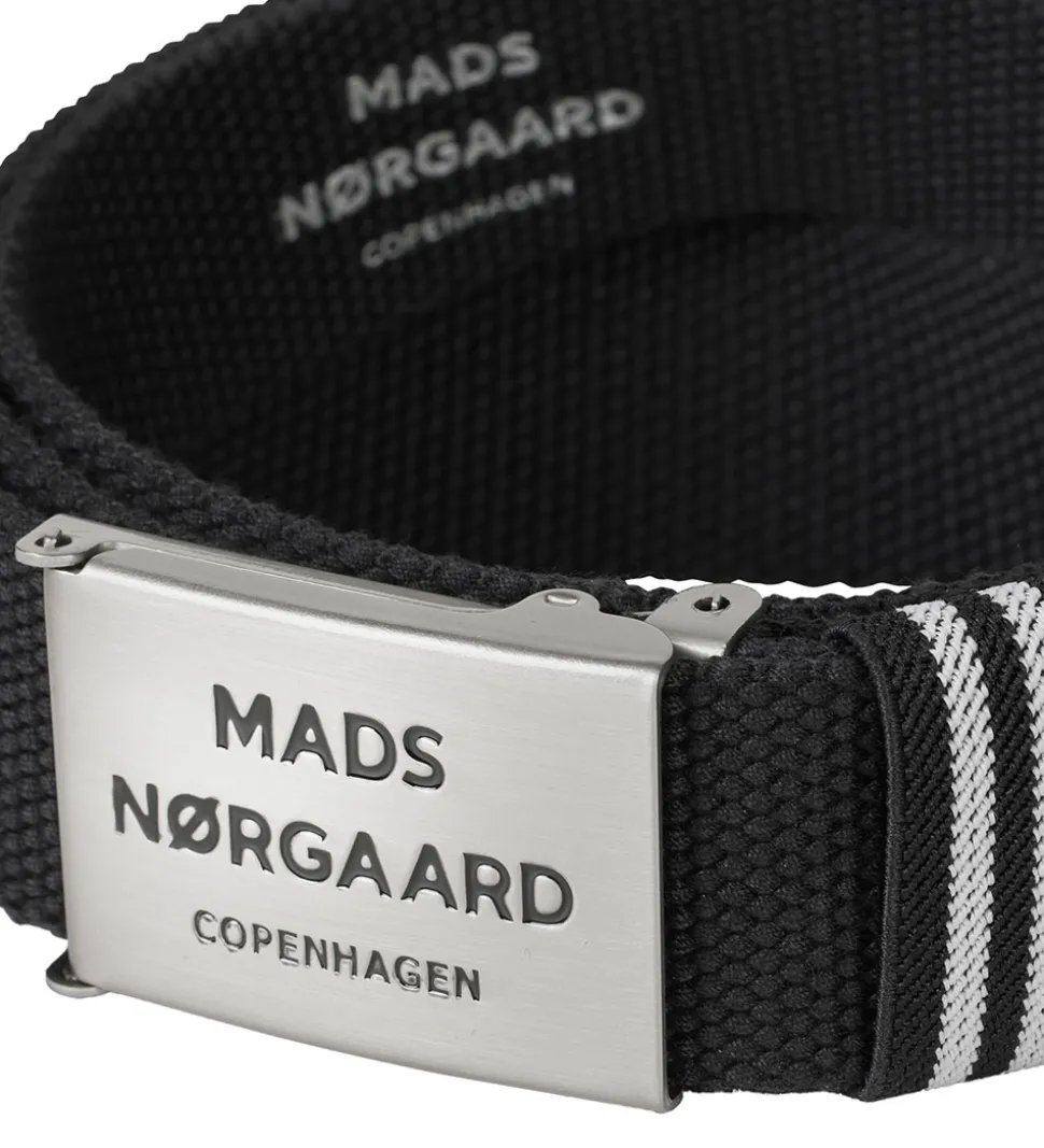 Praktisk Mads Nørgaard bælte i en navyblå nuance med en elegant metalspænde med et sort logo, og hvide striber. Mads Nørgaard bæltet åbnes fortil med en bæltespænde. Bæltet kan frit justeres, da det bliver holdt fast med tænder. Dette bælte tilføjer et stilfuldt touch til ethvert outfit fra Mads Nørgaard.