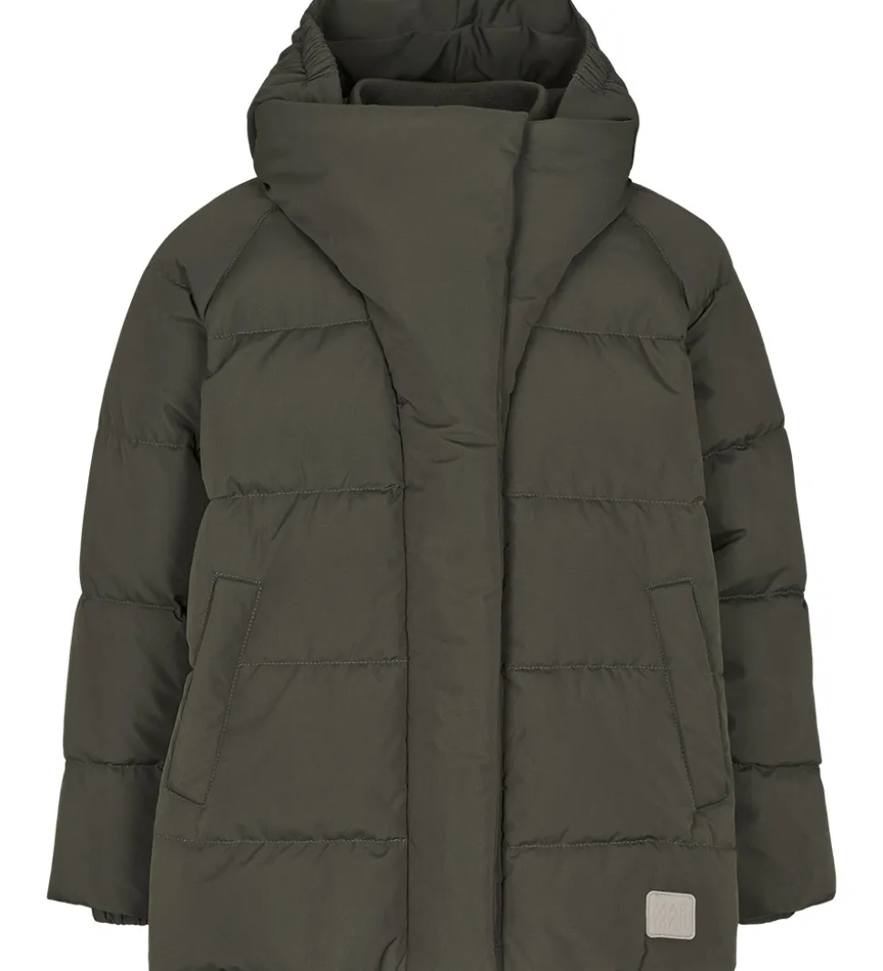 Smart Marmar dunjakke i mørkegrå med grønt skær. Dunjakken har vandrette syninger og et påsyet logo i grå nederst i venstre side.