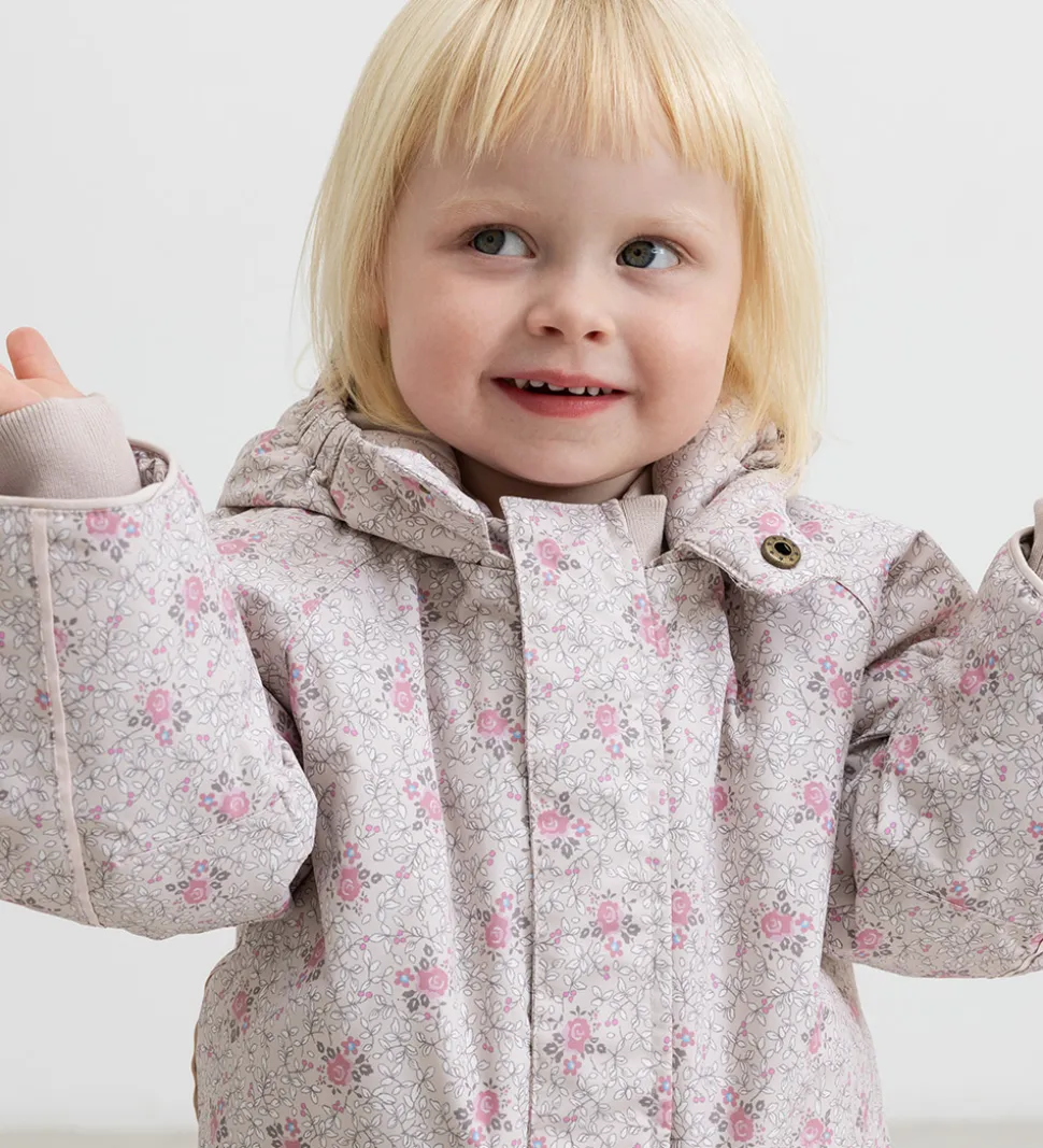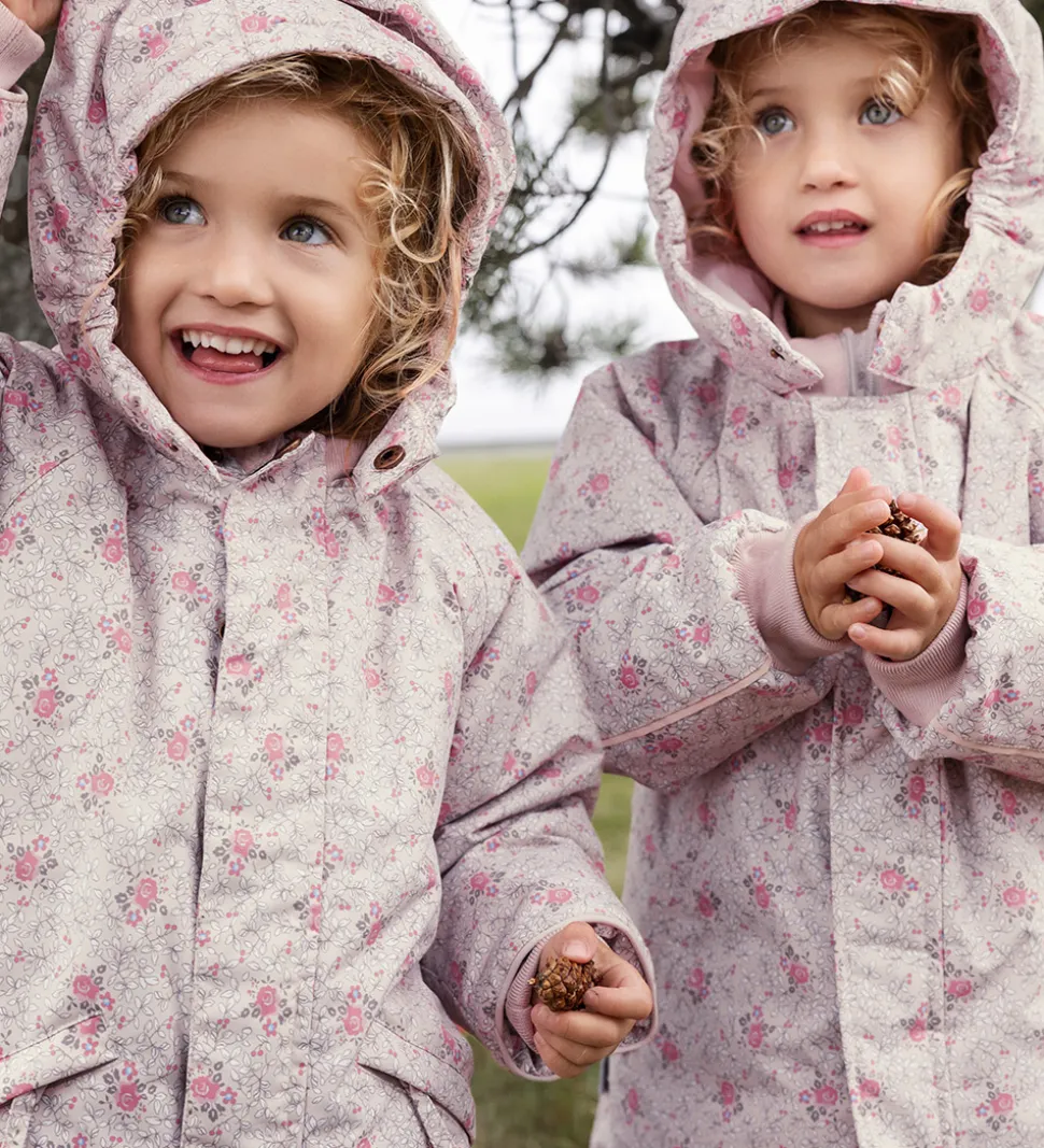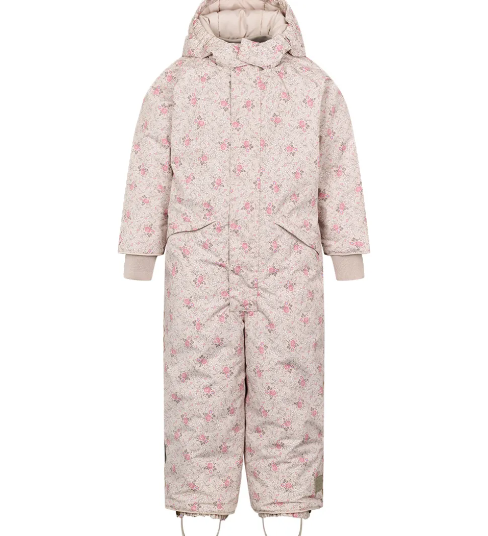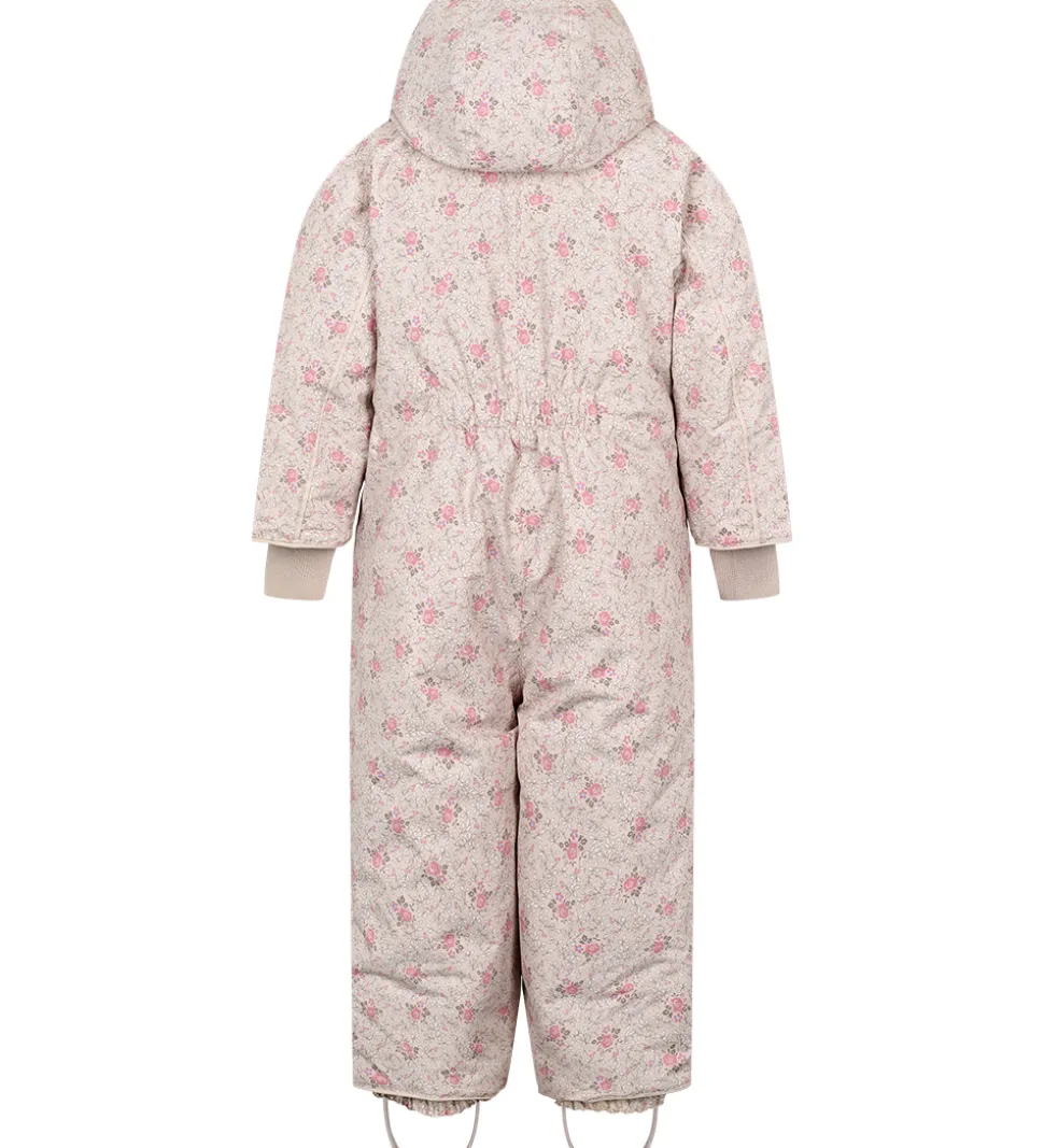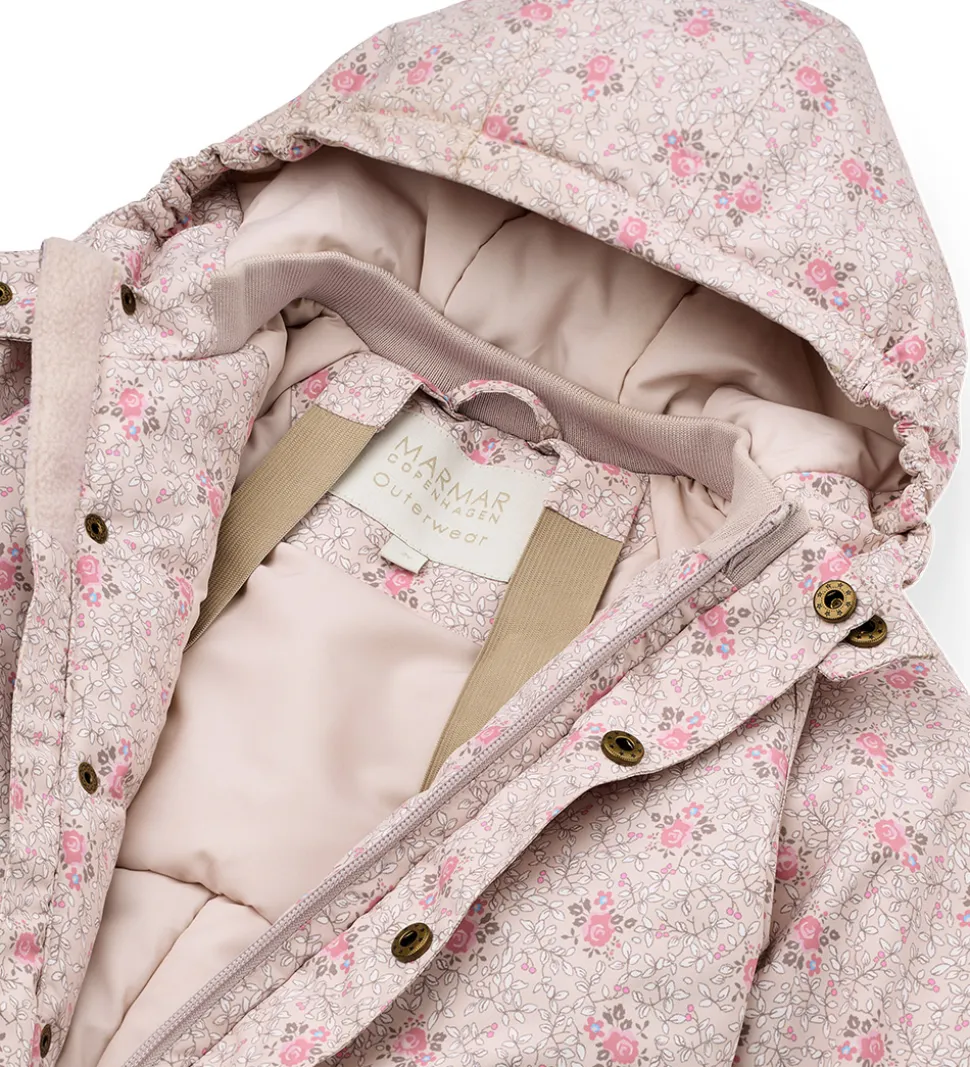 Flot MarMar flyverdragt i lys rosa med blomsterprint i rosa og brune nuancer med blå detaljer. Flyverdragten har praktiske refleksdetaljer.