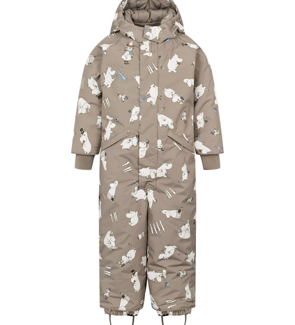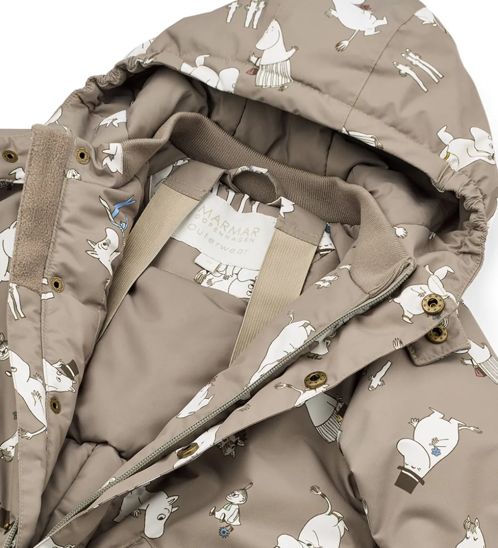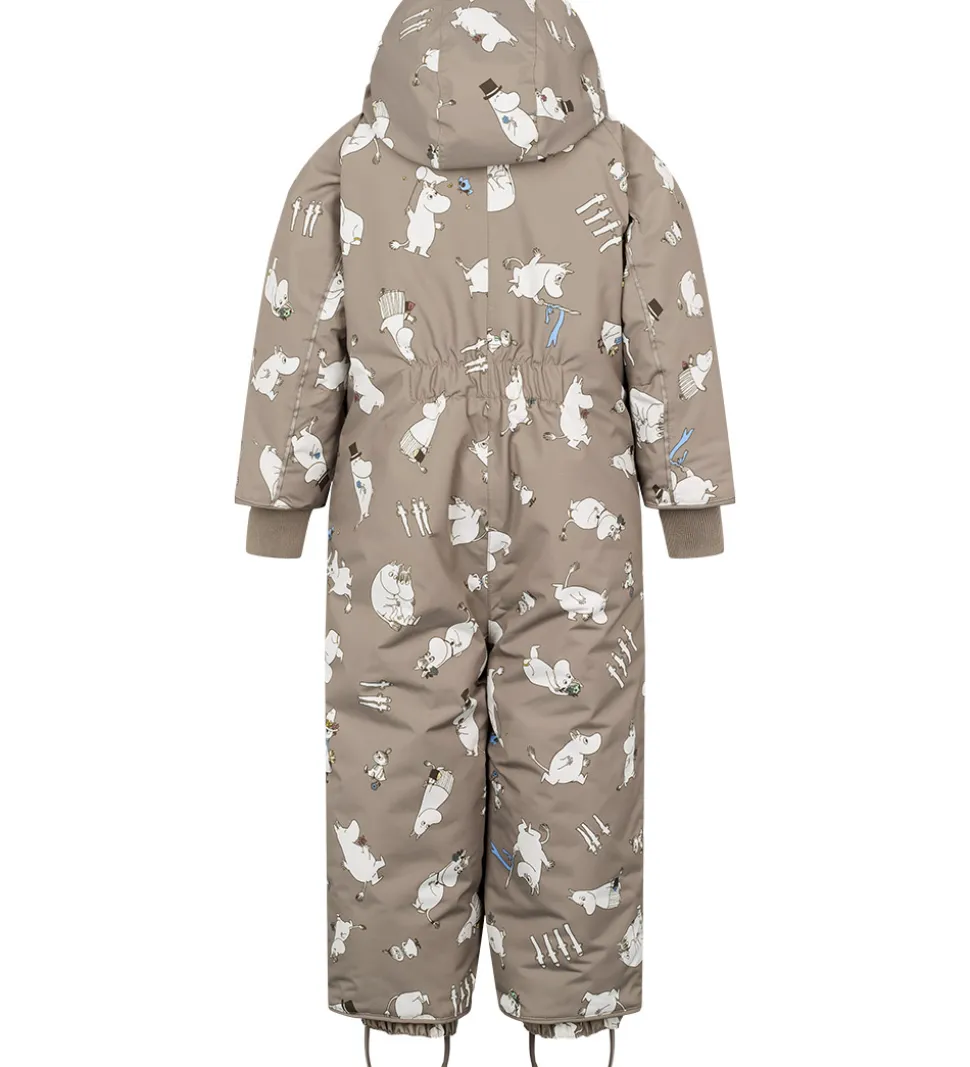 Fin MarMar flyverdragt i grågrøn med et alloverprint af motiver fra Mumitroldene. Flyverdragten har praktiske refleksdetaljer.