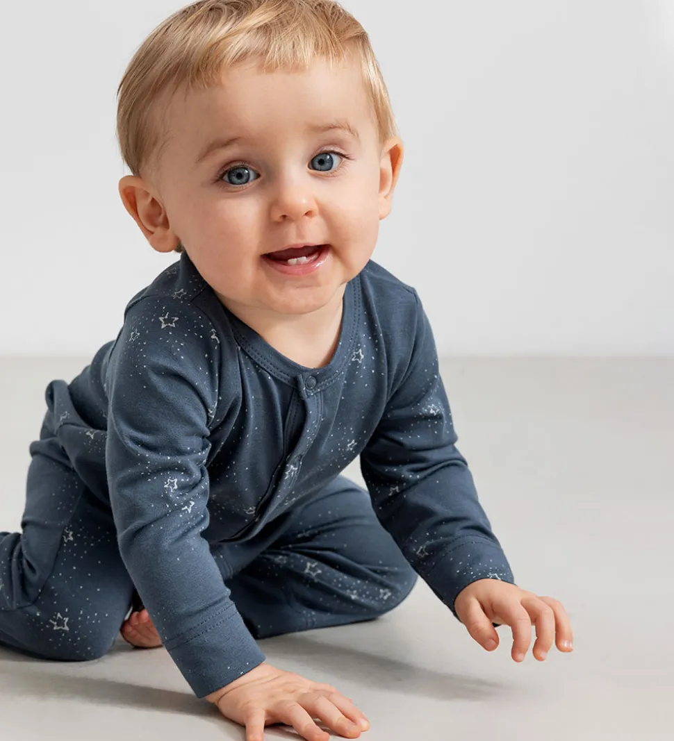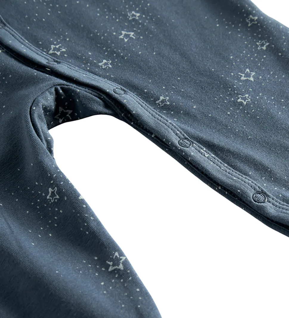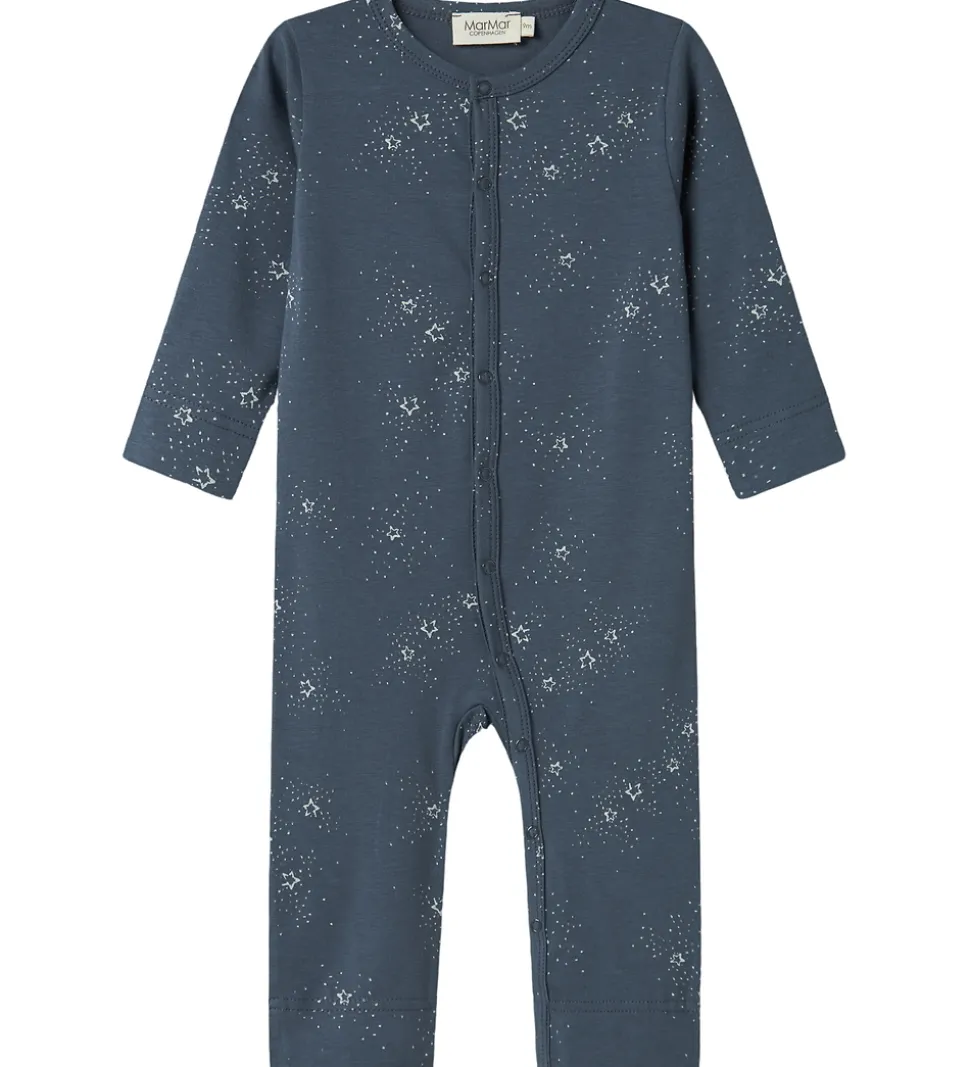 Elegante MarMar heldragt i en dyb blå farve prydet med et subtilt stjernemønster. Materialet er blødt og falder pænt, hvilket giver et flot udtryk.