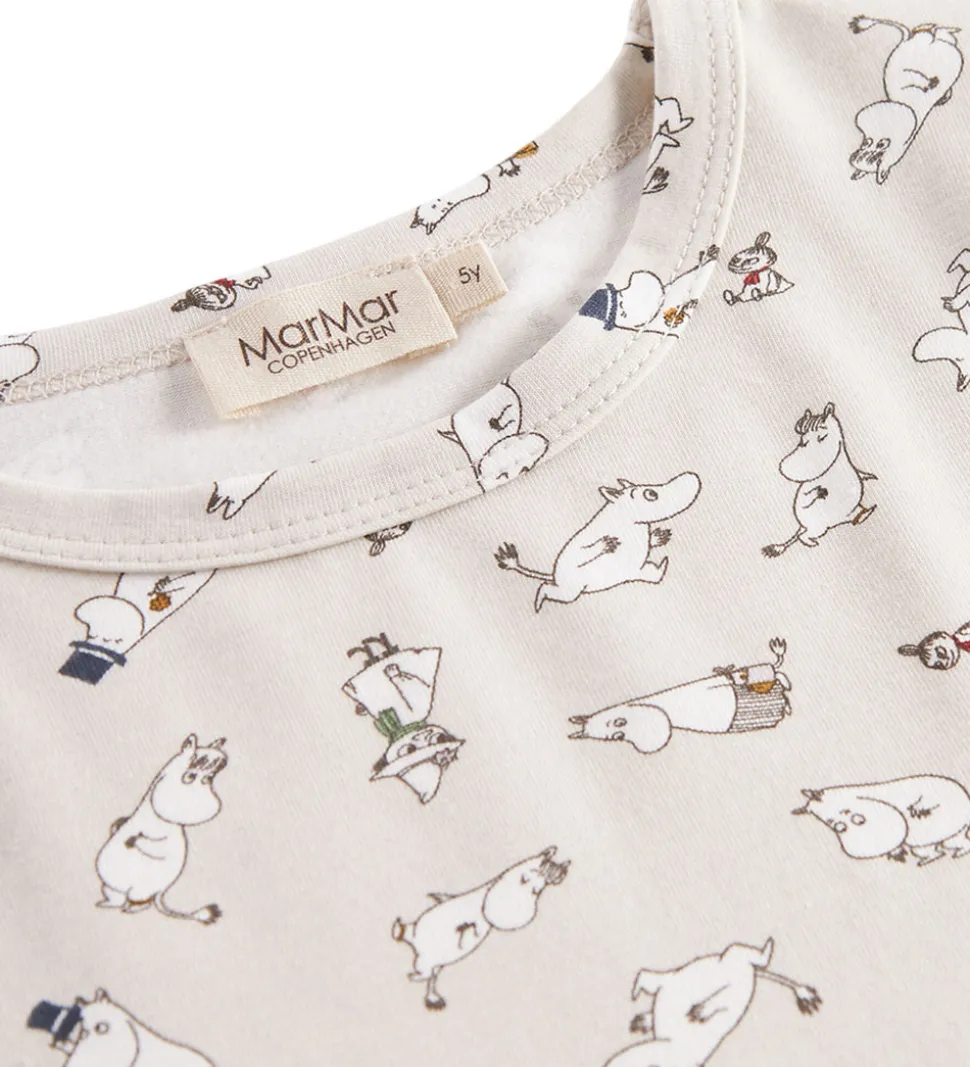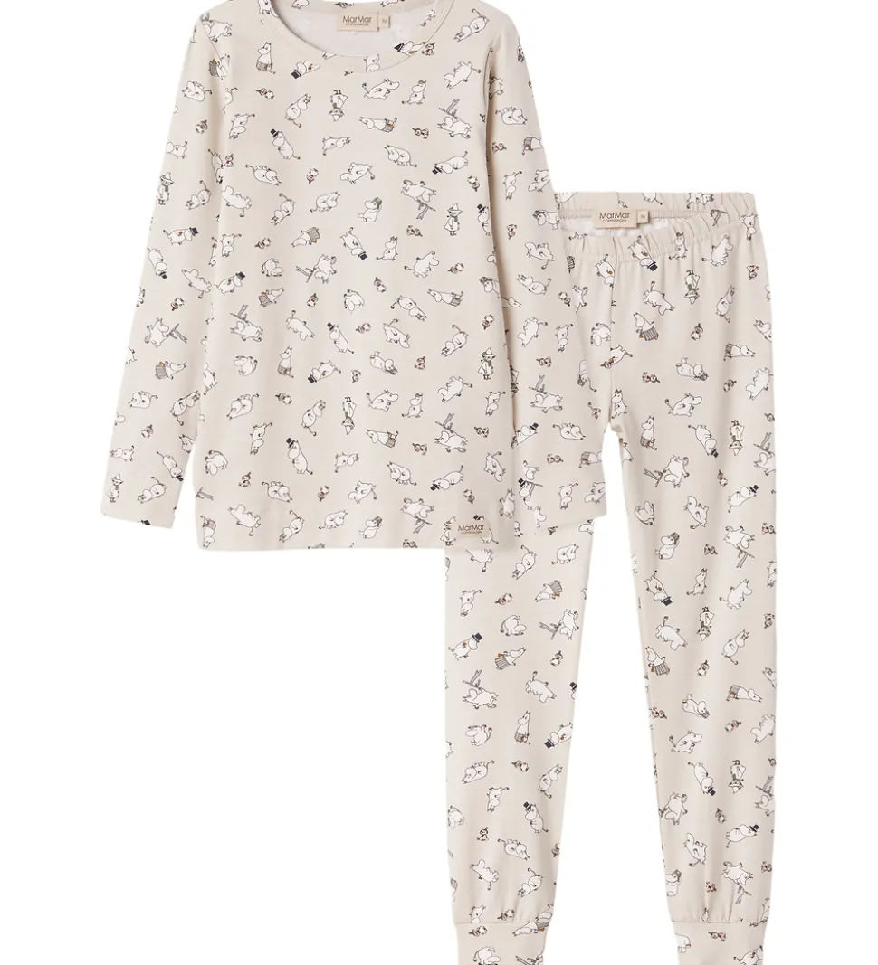 Dejligt MarMar nattøj i en gråbeige nuance med et sødt print af Moomins-figurer over det hele. Sættet består af en bluse med lange ærmer samt matchende bukser, perfekt til hyggelige stunder.