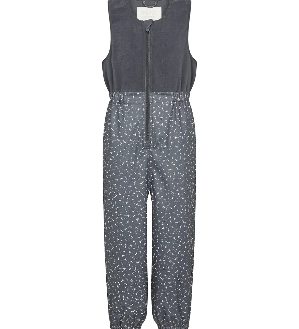 Fint MarMar regntøj i navy PU med et cremefarvet blomsterprint. Regntøjet består af en regnjakke og et par regnbukser med seler