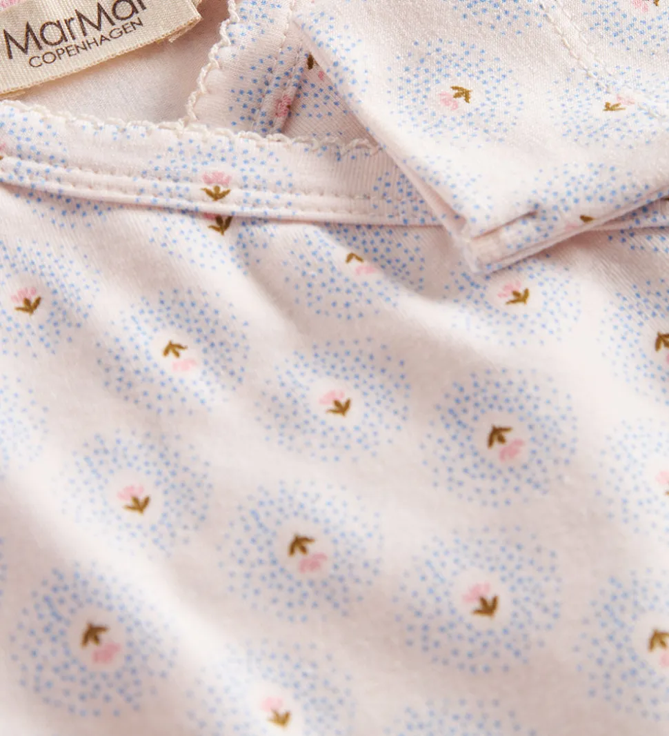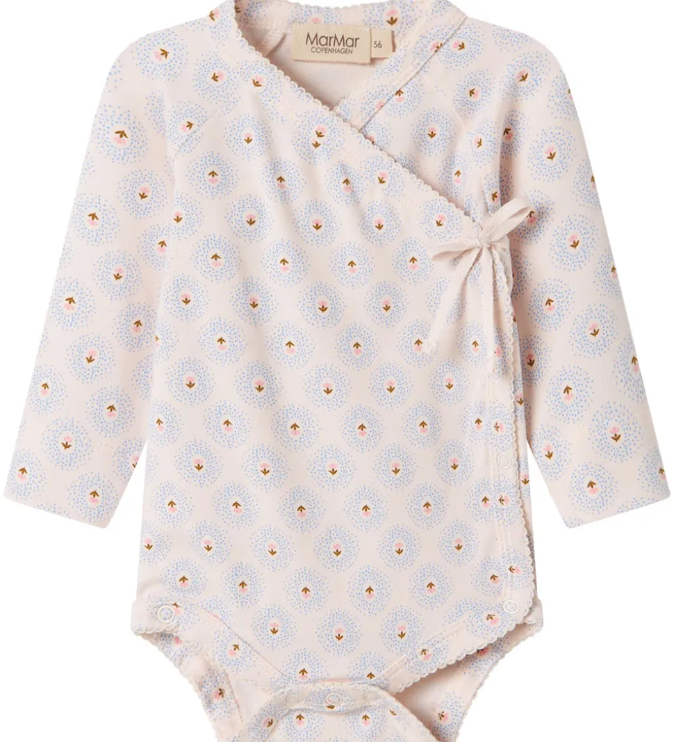 Elegant MarMar slå-om body i cremehvid med lange ærmer og et smukt alloverprint af små blomster og prikker i lyseblå og rosa.