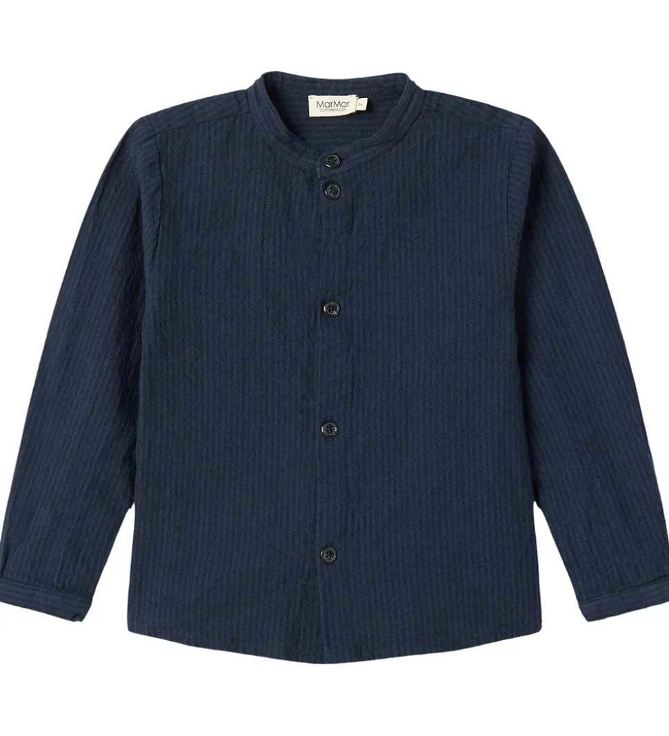 Flot MarMar skjorte i en dyb, marineblå farve med striber. Skjorten har lange ærmer og en rund halsudskæring. Den er designet med en enkel række knapper foran, hvilket giver et stilrent udtryk.