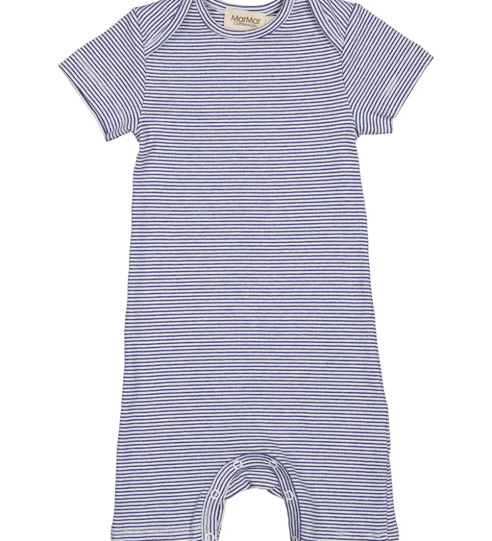 Sommerdragten har korte ørmer og korte ben. Dragten har praktiske foldeskuldre, mens den mellem benene kan åbnes helt af trykknapper. Designet sikrer komfort og bevægelsesfrihed for de små, mens den stilfulde farvekombination tilføjer et friskt udtryk.