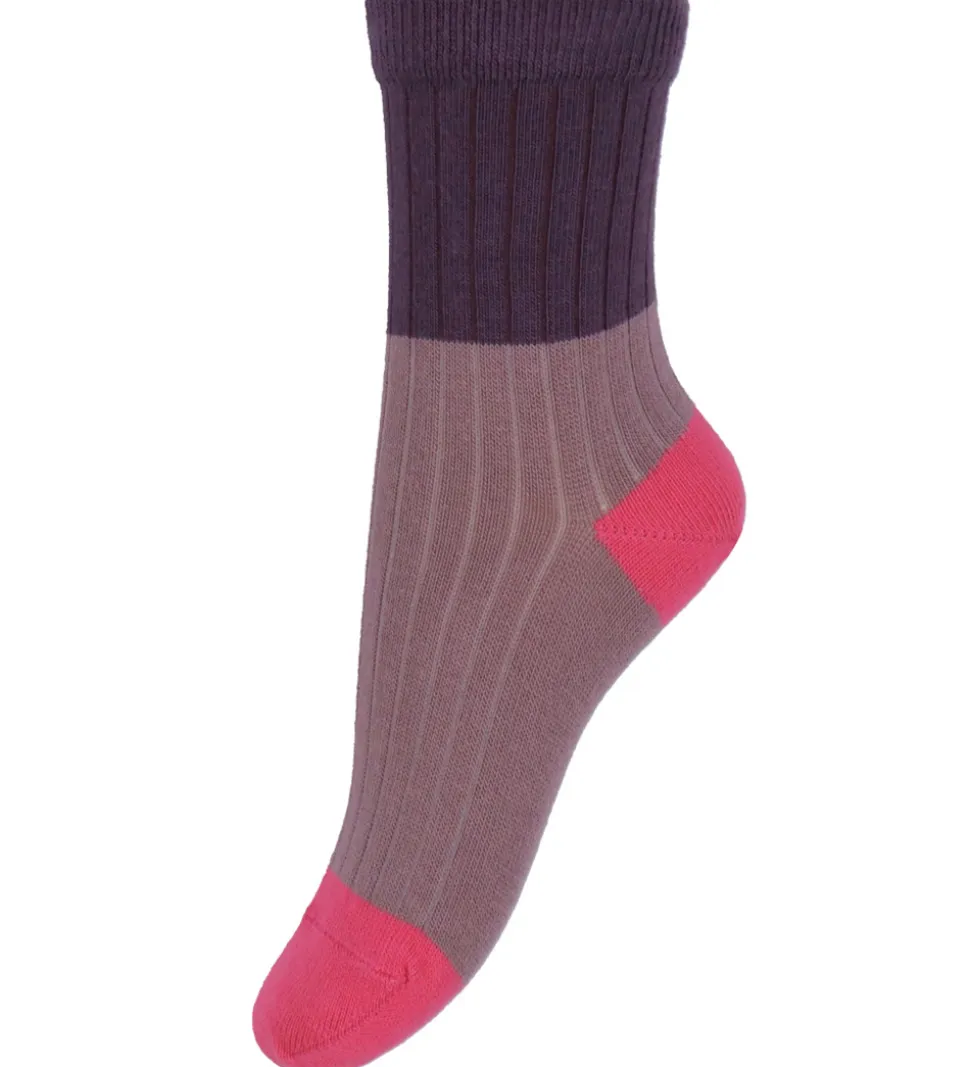Elegant Melton strømpe med et almindeligt længde skaft i en kombination af mørklilla, støvet lilla og pink. Melton strømpen har en ribbet struktur med en bred elastikkant øverst, som sikrer en god pasform. Hælen og tåen er fremhævet i en klar pink farve.
