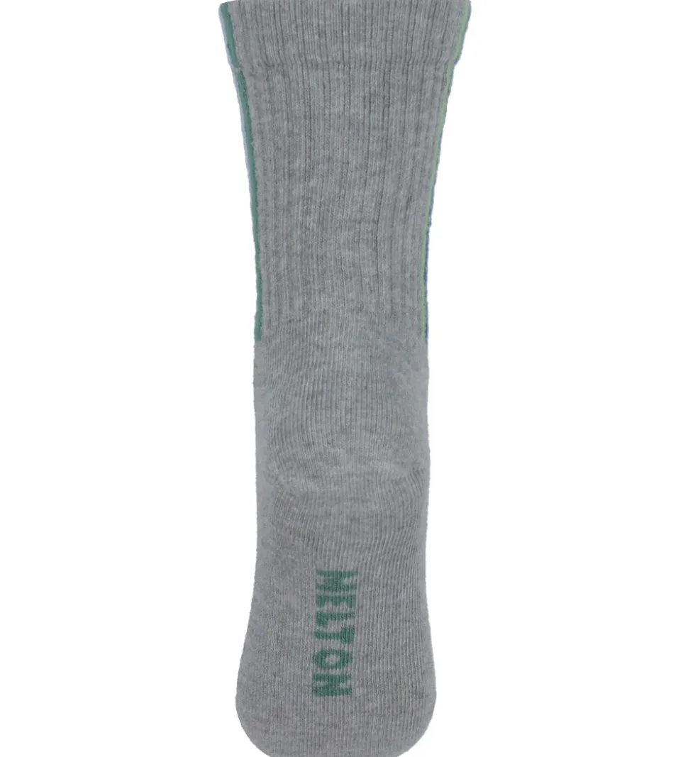 Stilfulde Melton strømper i grå med lodrette striber i grønne og blå nuancer ned ad siderne på skaftet. Strømperne har en ribstrikket struktur og en elastisk ribkant øverst, som sikrer en god pasform. Melton strømperne tilbyder en klassisk og tidløs stil.
