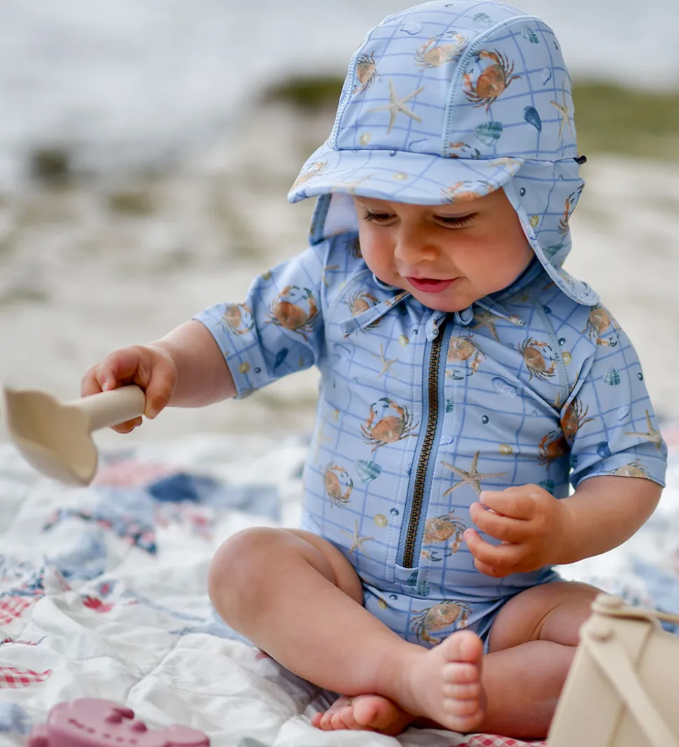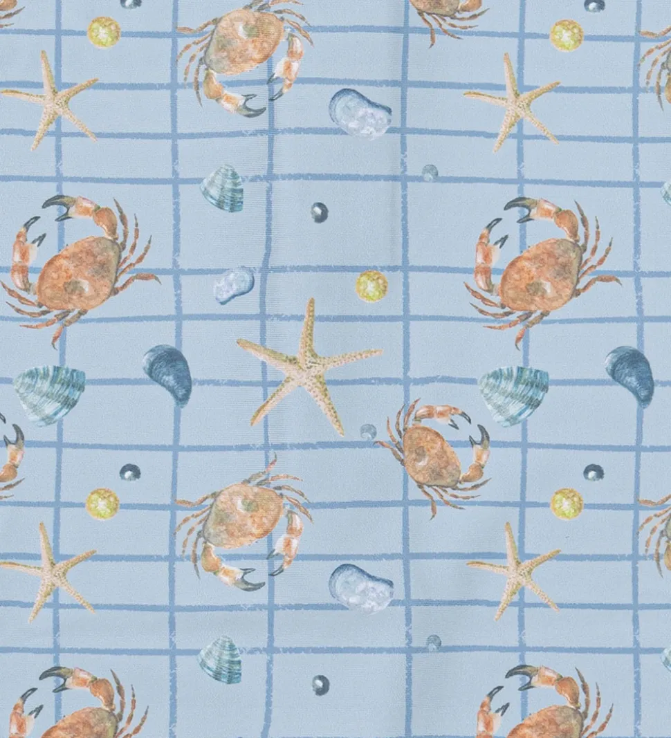 Dejlig Mikk-Line badeheldragt med korte ærmer i en lys blå farve. Den har et charmerende print med krabber og søstjerner. Mikk-Line badeheldragten har en praktisk lynlås foran.