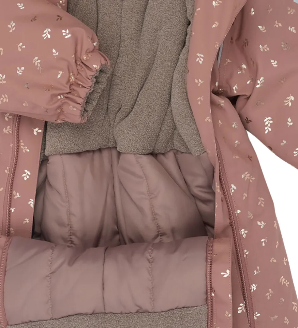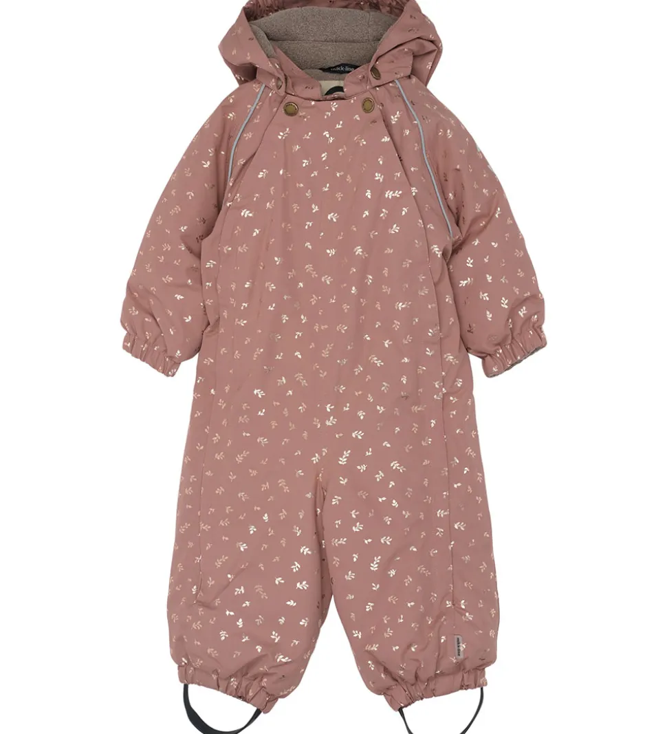 Fin Mikk-Line flyverdragt i rosa med et guldfarvet print med blade.