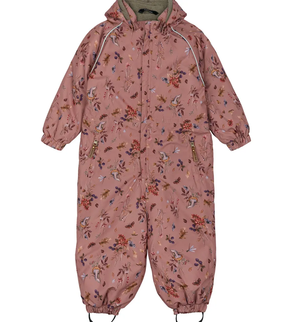 Fin Mikk-Line flyverdragt i rosa med efterårsprint af blomster, svampe og insekser. Flyverdragten har refleksdetaljer langs skuldrene, på venstre ærmer og på hætten.