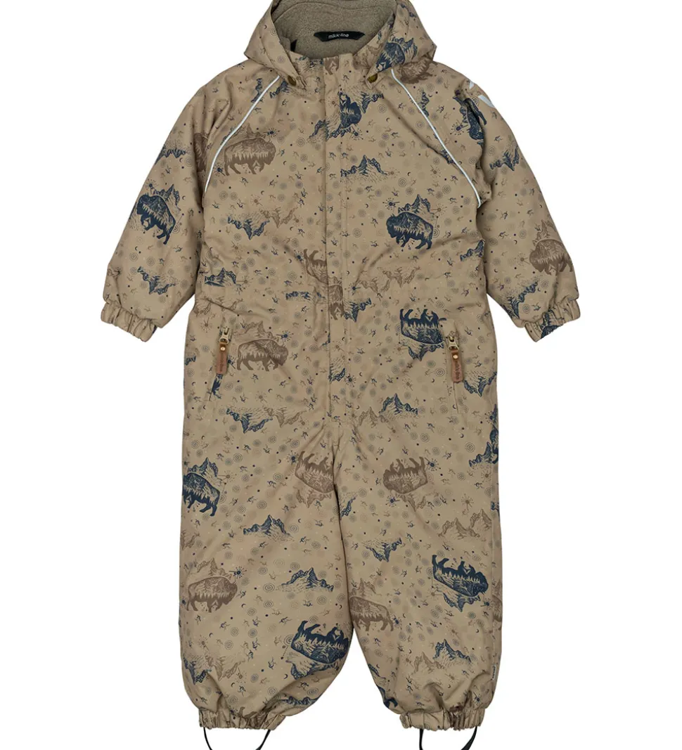 Fin Mikk-Line flyverdragt i støvetgrøn med et alloverprint med bl.a. bisonokser og klippeformationer brune og blå farver. Flyverdragten har refleksdetaljer langs skuldrene, på venstre ærmer og på hætten.