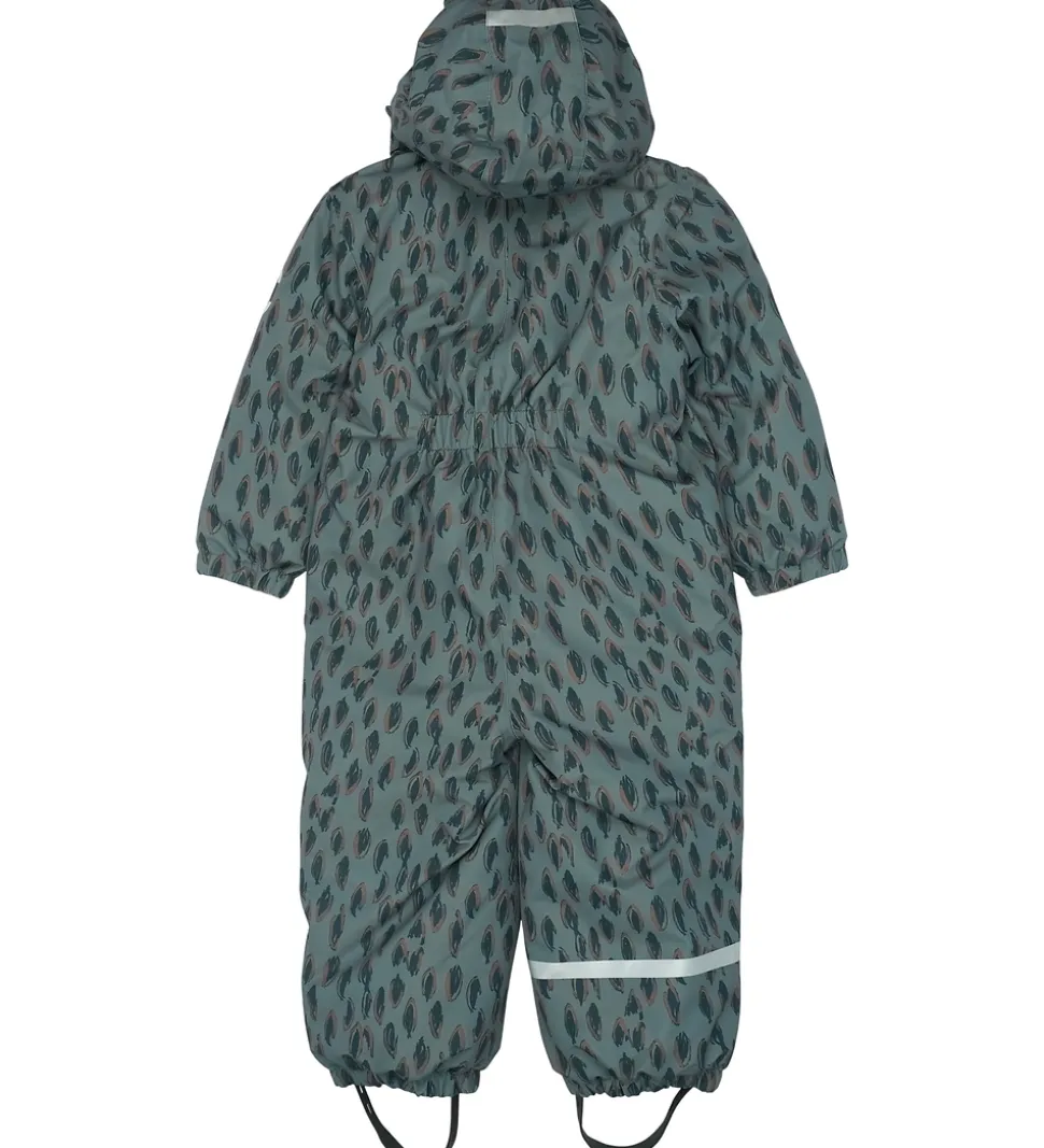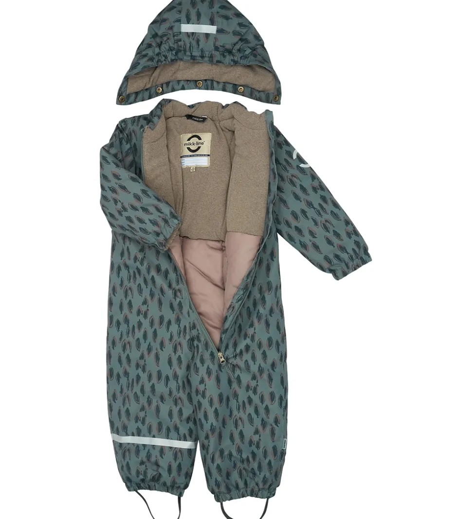 Flot Mikk-Line flyverdragt i en mørk, støvet grøn farver og med et bladlignende allovermønster. Flyverdragten har refleksdetaljer på hætten, venstre ærme og højre ben.
