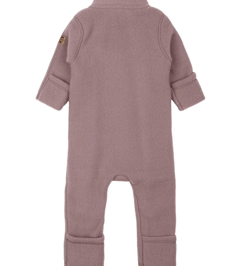 Hyggelig Mikk-Line køredragt af filtet uld i støvet lilla og med et lille, brunt logo på venstre ærme.