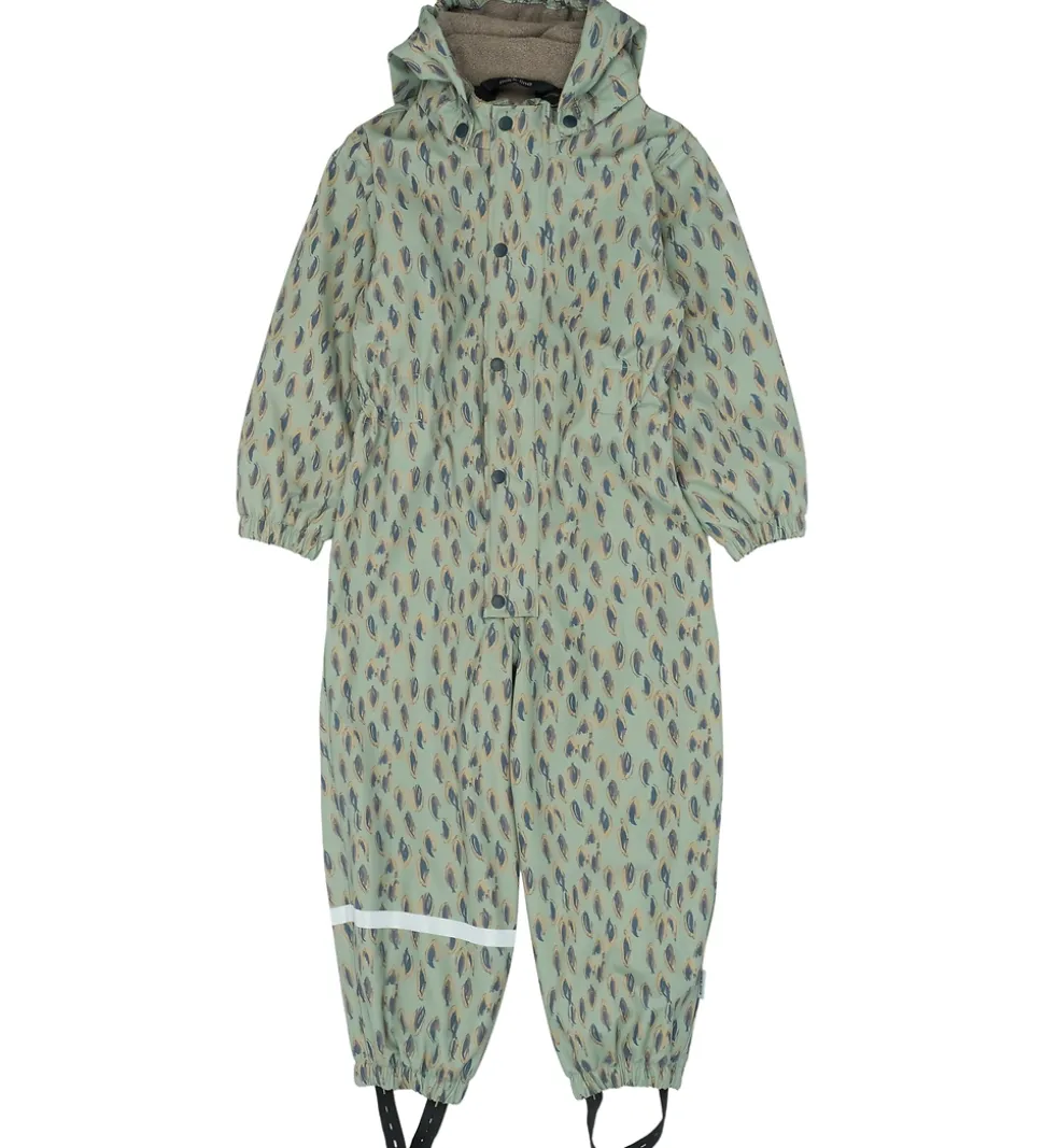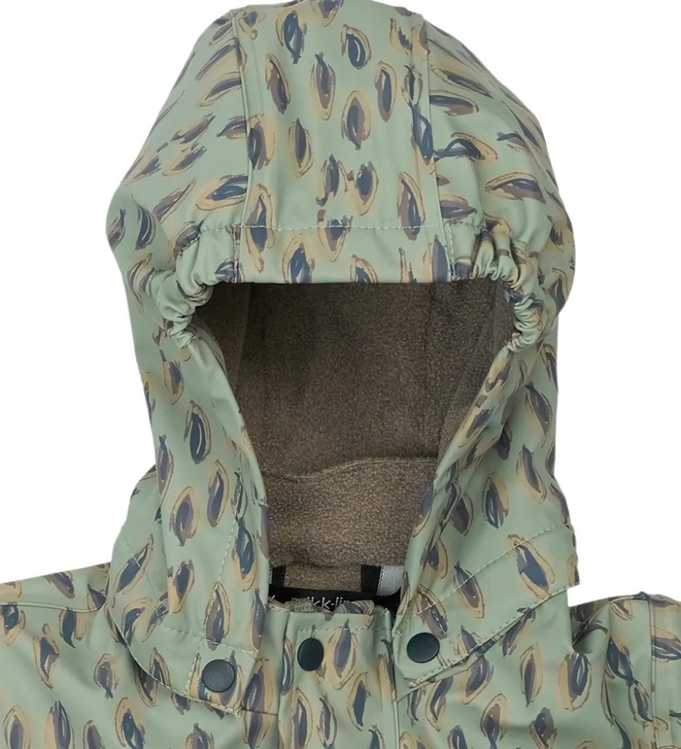 Flot Mikk-Line regndragt i støvet grønt PU med et print i brune nuancer samt blå.