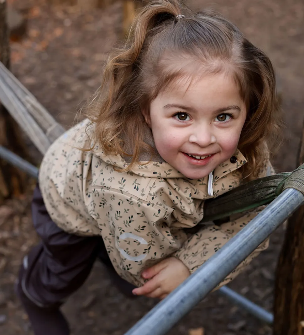 Sejt Mikk-Line regntøj af PU bestående af en regnjakke og et par regnbukser med seler. Regnbukserne er i ensfarvet mørkebrun, mens regnjakken er i lysebrun med et plante-alloverprint i grønne og brune nuancer.