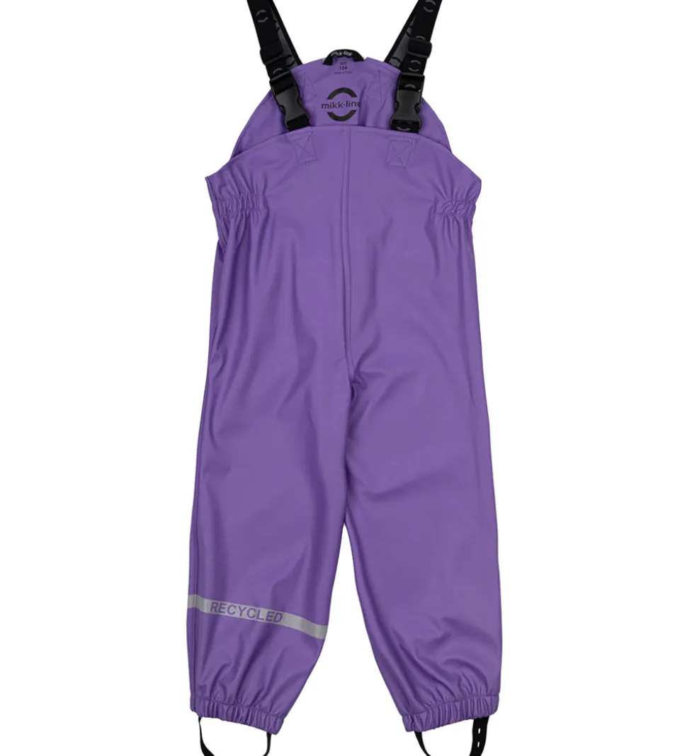 Pænt Mikk-Line regntøj bestående af et par regnbukser med seler og en regnjakke i ensfarvet skarp lilla samt med velplacerede refleksdetaljer og -logoer.