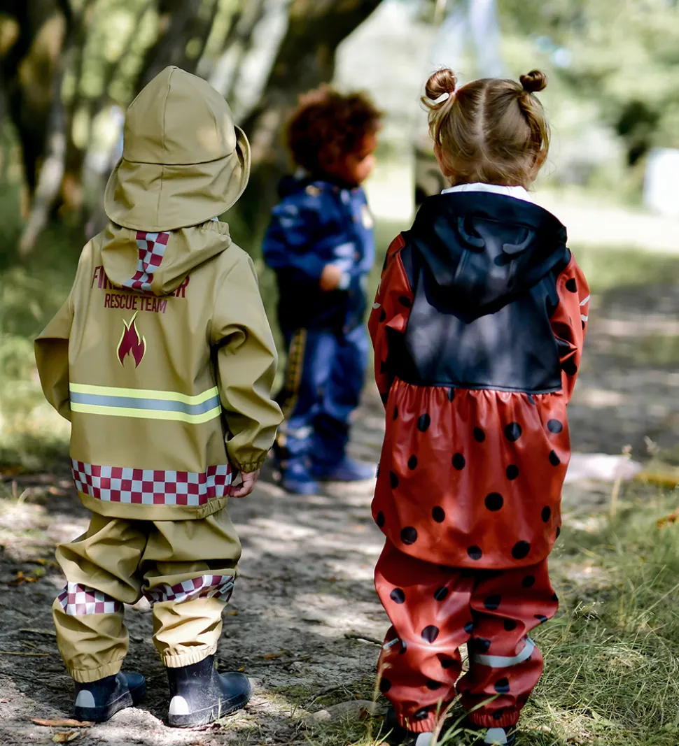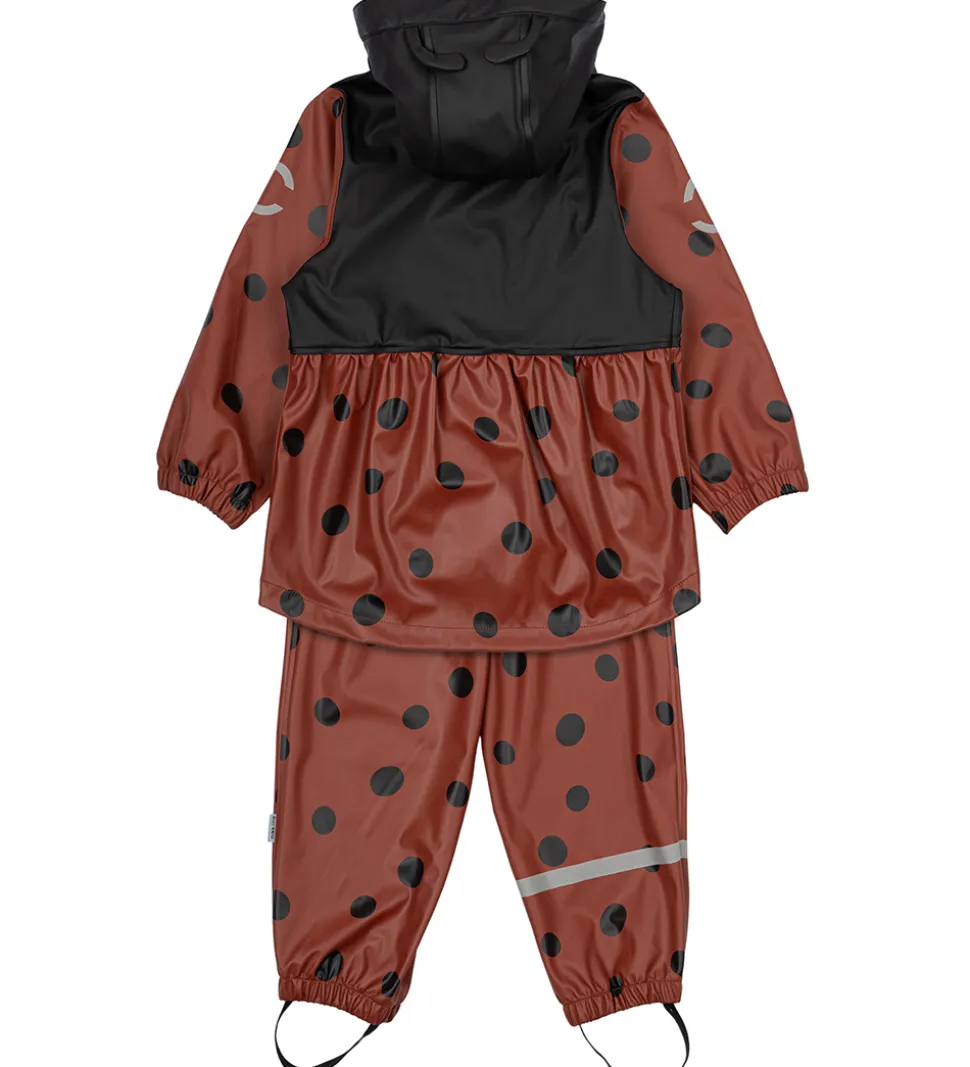 Sejt Mikk-Line regntøj af PU bestående af et par regnbukser med seler og en regnjakke. Regntøjet er mørk rødbrun og sort og i et mariehønedesign, som er lavet, så det ligner et mariehøne-kostume.