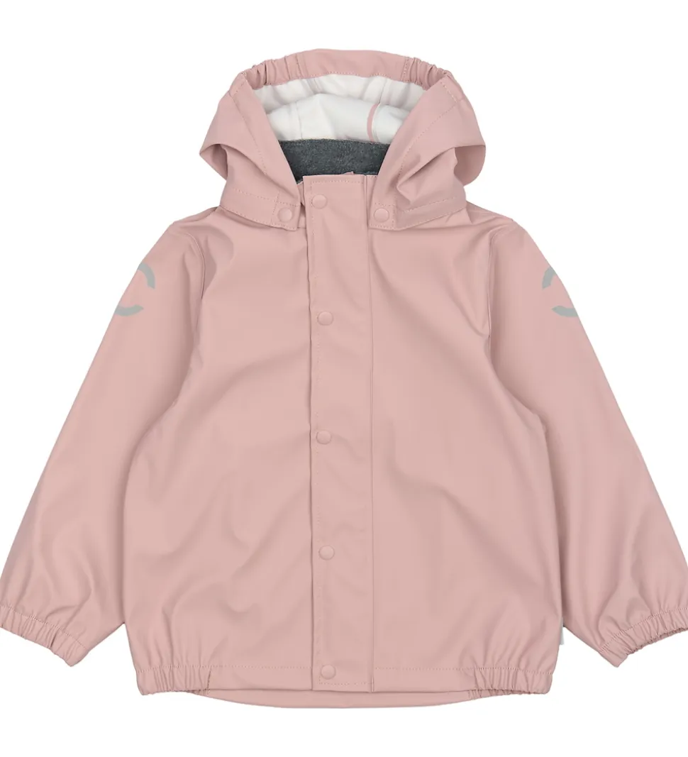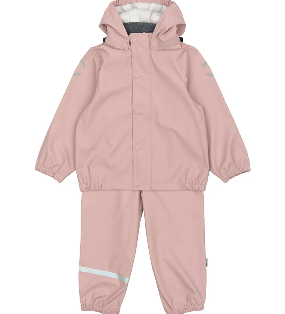 Flot Mikk-Line regntøj bestående af en regnjakke og et par regnbukser i ensfarvet, rosa PU.