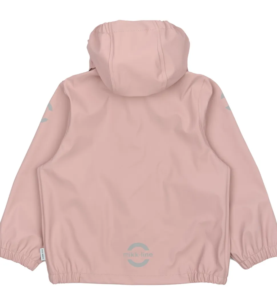 Mikk-Line regnjakken har en aftagelig hætte, der sidder fast med trykknapper. Hætten har en elastikkant i begge sider af ansigtsåbningen, så den sidder tæt til, og i halskraven er der foret med blødt, gråt fleece. Der er elastikkanter ved håndleddene, og i bunden er der elastikkanter i siderne. Regnjakken åbnes fortil ved hjælp af en lynlås med udvendig vindstolpe, som lukkes til med trykknapper.