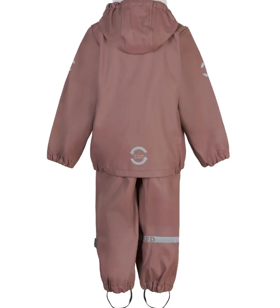 Skønt Mikk-Line regntøj bestående af en regnjakke og et par regnbukser i ensfarvet, mørkerosa PU.