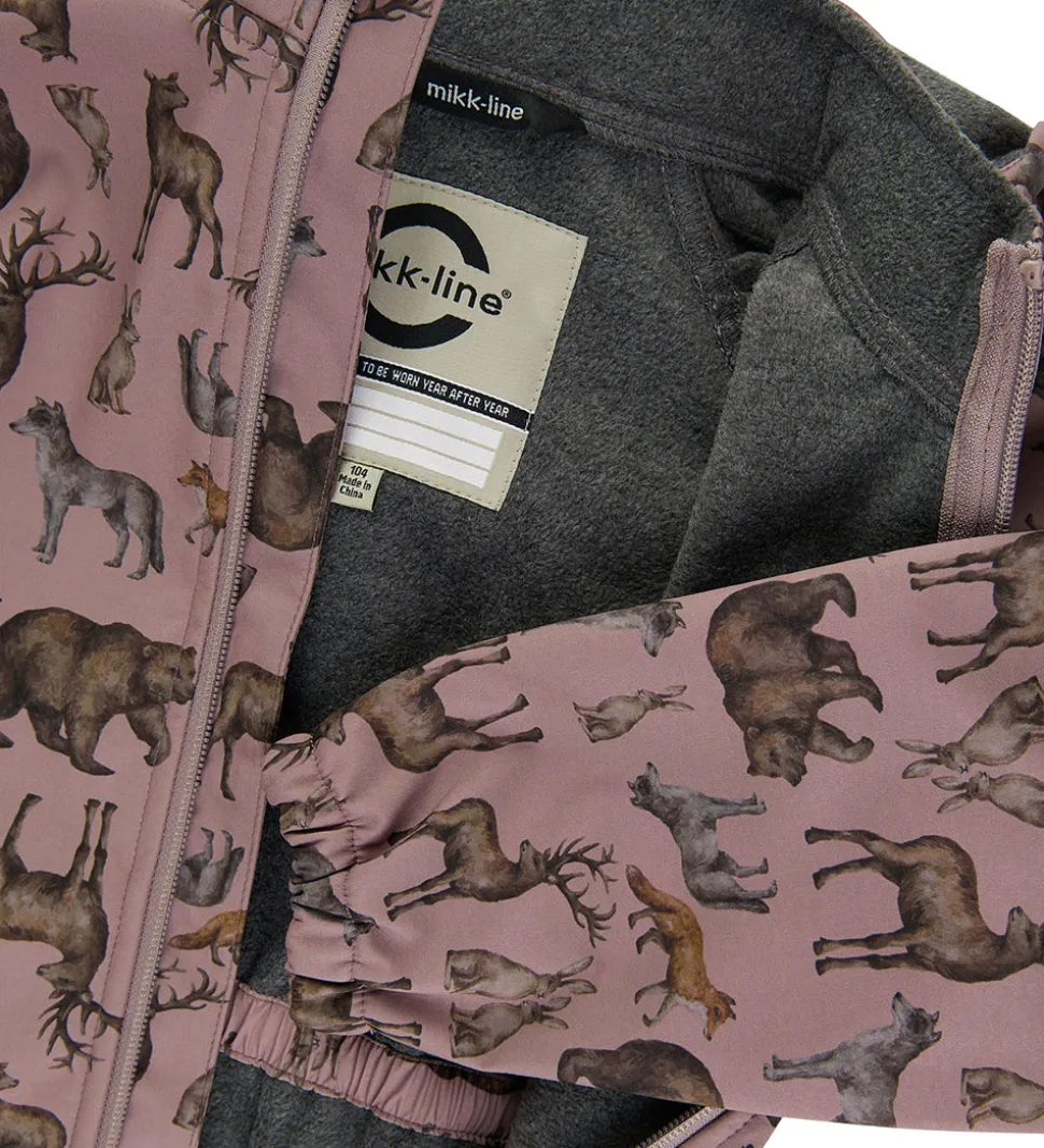 Fed Mikk-Line softshelljakke i mørk, støvet rosa med et med et alloverprint af nordiske skovdyr i afdæmpede nuancer.