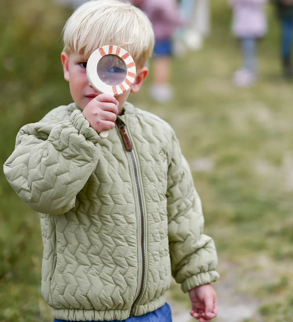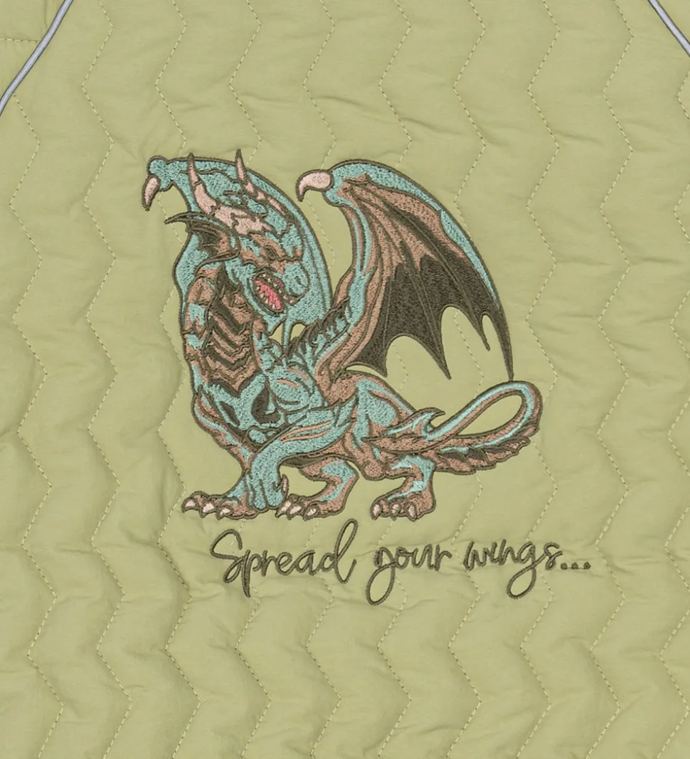 Fed Mikk-Line sommerjakke i lys, støvet grøn med en quiltet, zigzagget struktur. På ryggen er der broderet en drage.