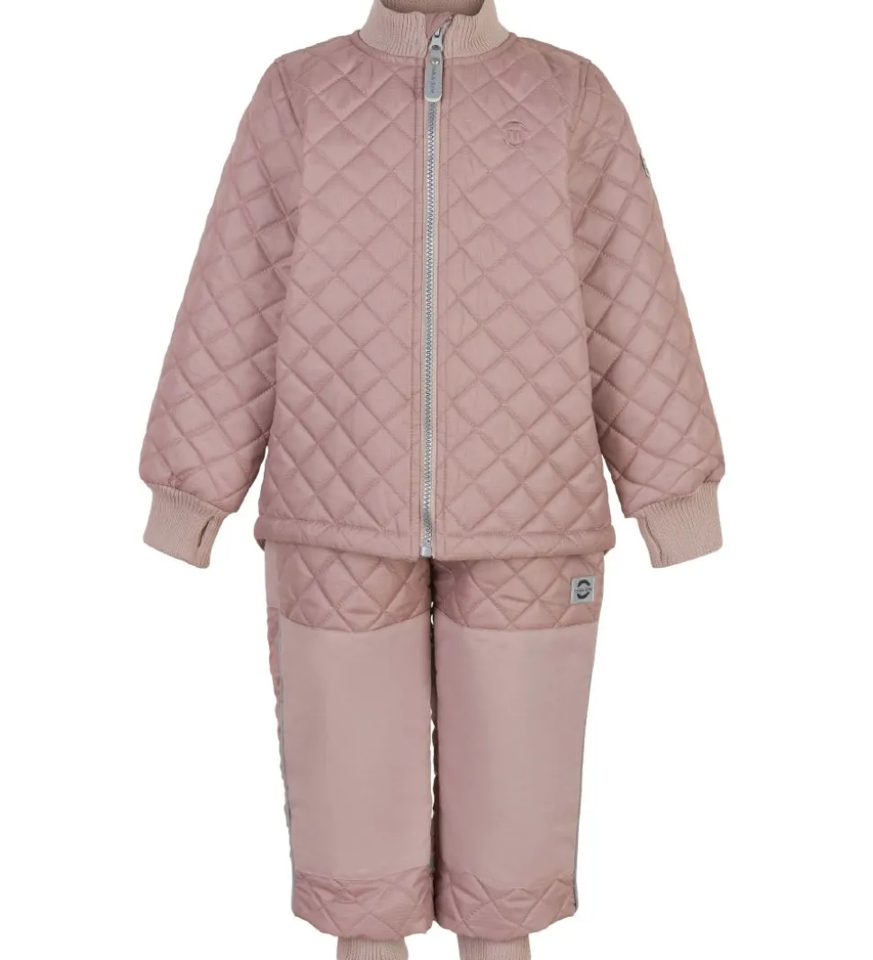 Sødt Mikk-Line termotøj bestående af en termojakke og et par termobukser i rosa med en quiltet struktur.