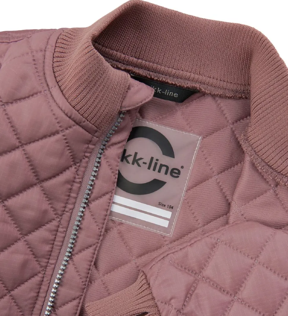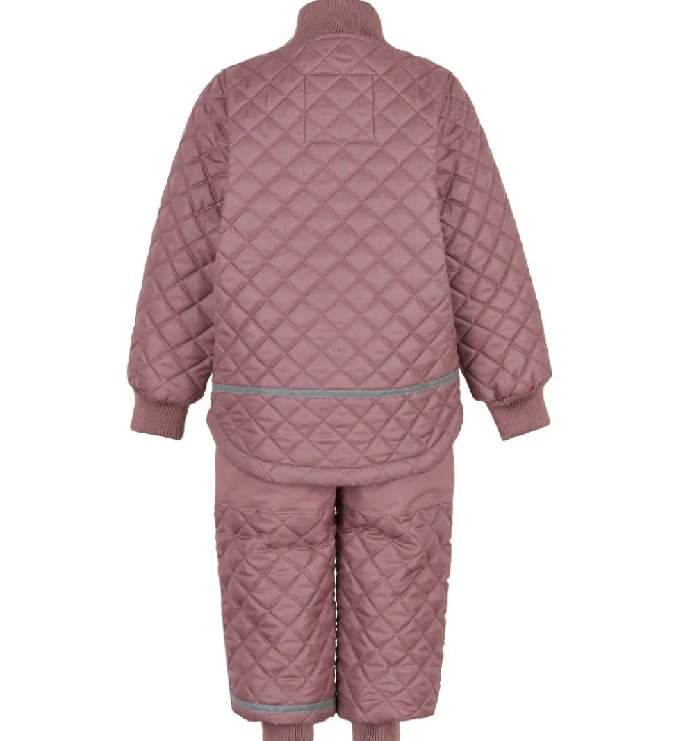 Yndigt Mikk-Line termotøj bestående af en termojakke og et par termobukser i mørkerosa med en quiltet struktur.