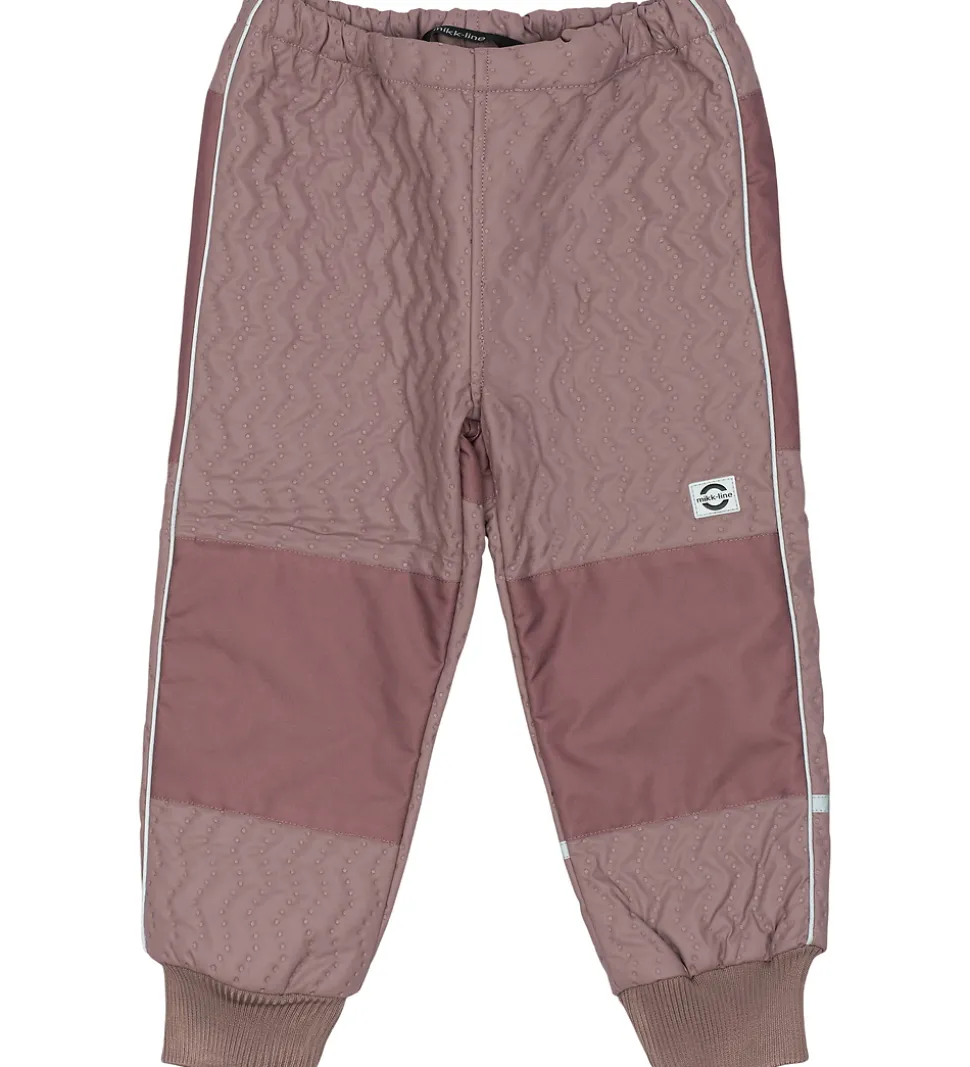 Mikk-Line termobukserne har en smal, justerbar elastik i livet, og buksebenene har brede ribkanter. På numsen og knæene er der praktiske forstærkninger. Både termobukserne og termojakken har praktiske reflekser.
