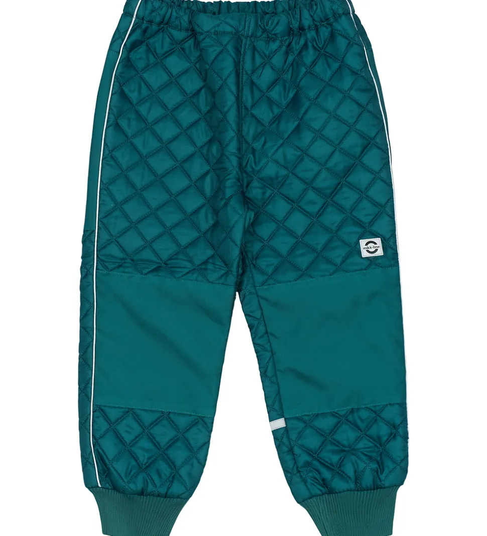 Fint Mikk-Line termotøj bestående af en termojakke og et par termobukser i grønblå med en quiltet struktur.
