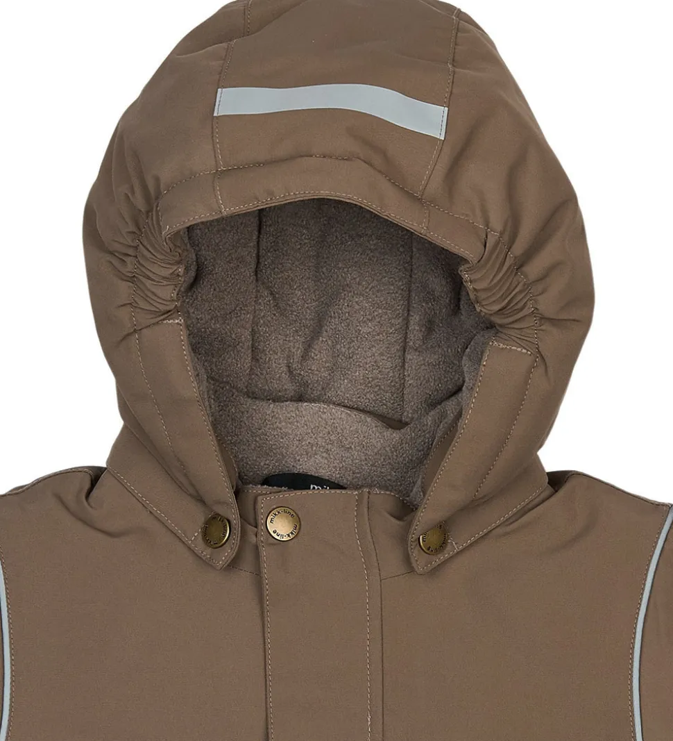 Pæn Mikk-Line vinterjakke i lysebrun. Vinterjakken har refleksdetaljer på hætten, nederst på ryggen og omkring skuldrene.