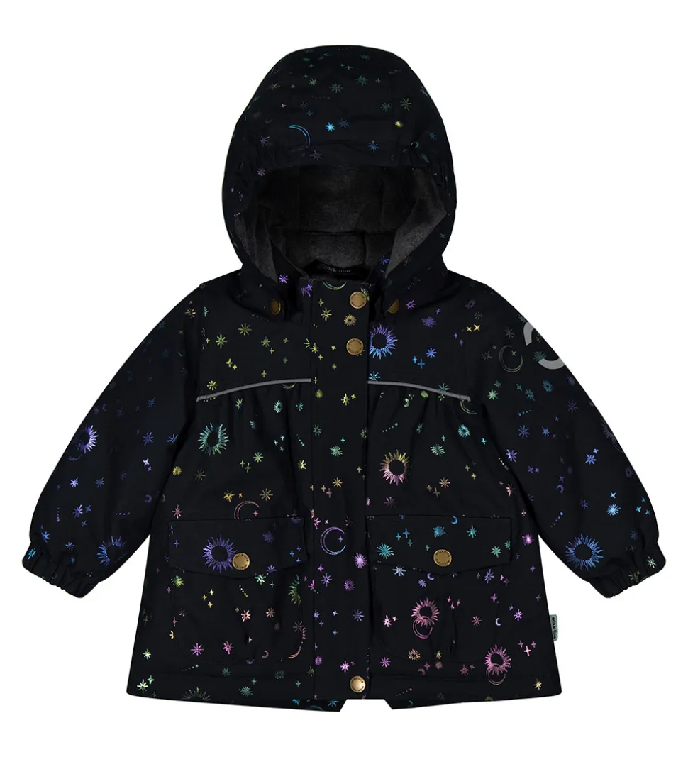 Lækker Mikk-Line vinterjakke i mørk navyblå med et alloverprint af måner og stjerner i skinnende farver, der changerer i rosa, blå, lilla, kobber og guld.