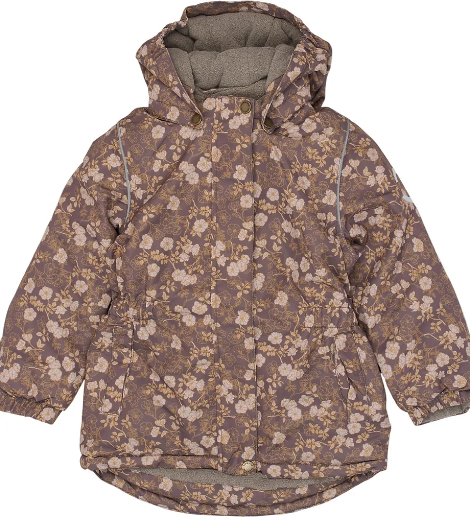 Pæn Mikk-Line vinterjakke i en mørk, støvet lilla farve og med et alloverblomsterprint i guld og beige. Vinterjakken har refleksdetaljer på hætten, nederst på ryggen og omkring skuldrene.