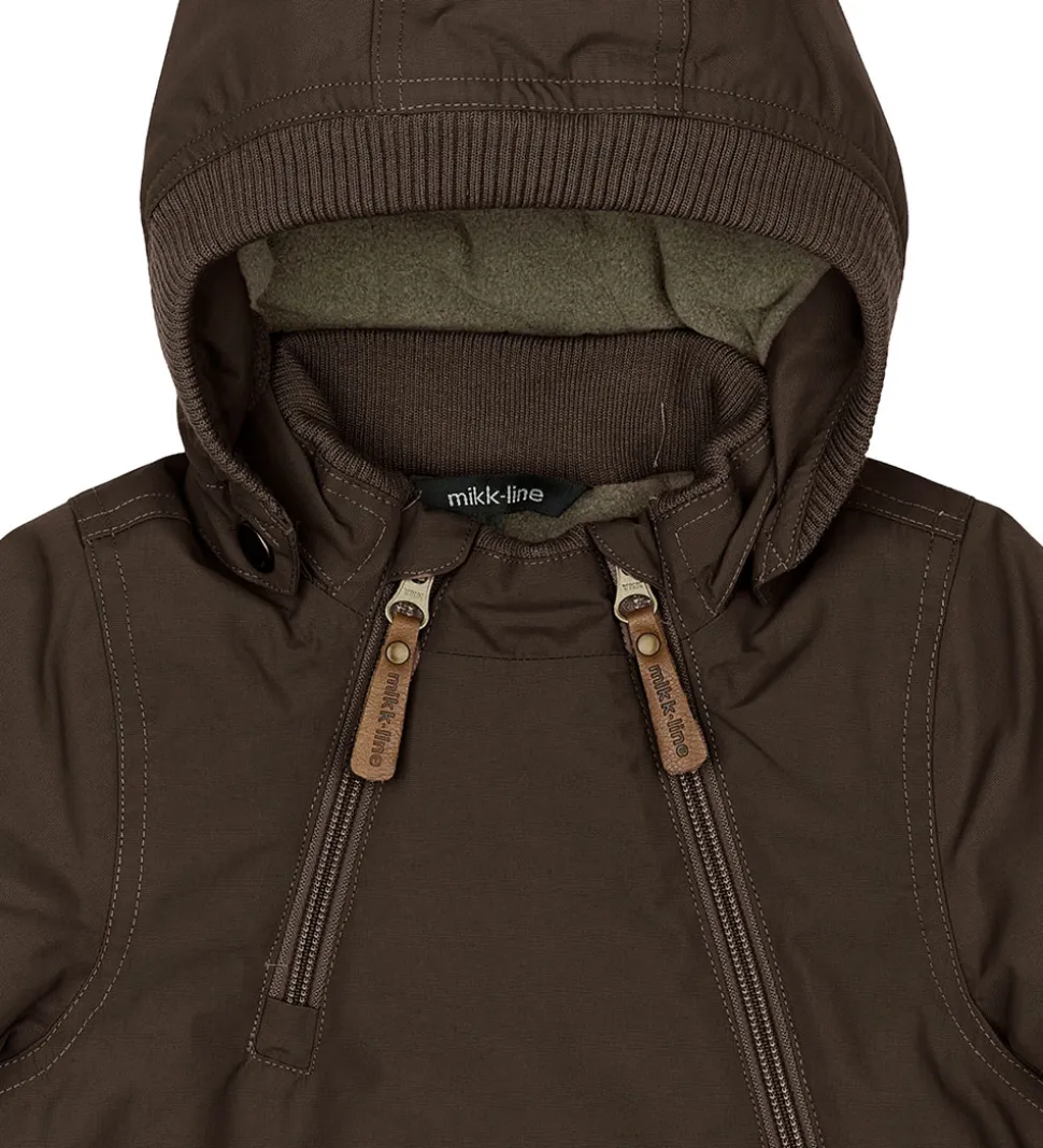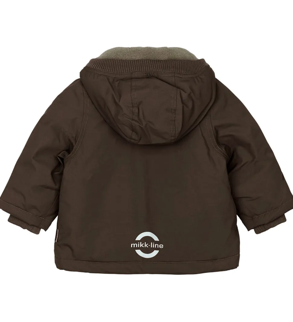 Dejlig Mikk-Line vinterjakke i mørkebrun med refleksdetaljer på venstre ærme og nederst på ryggen.