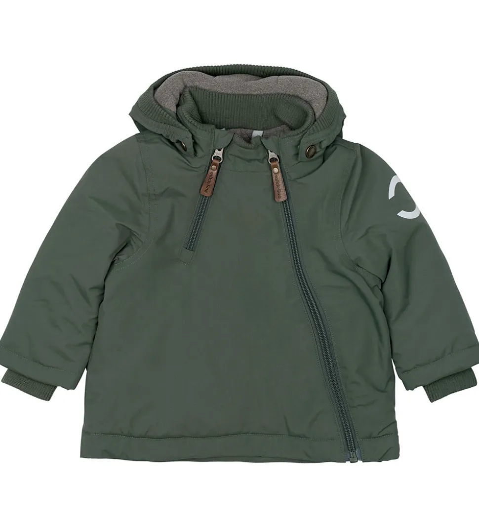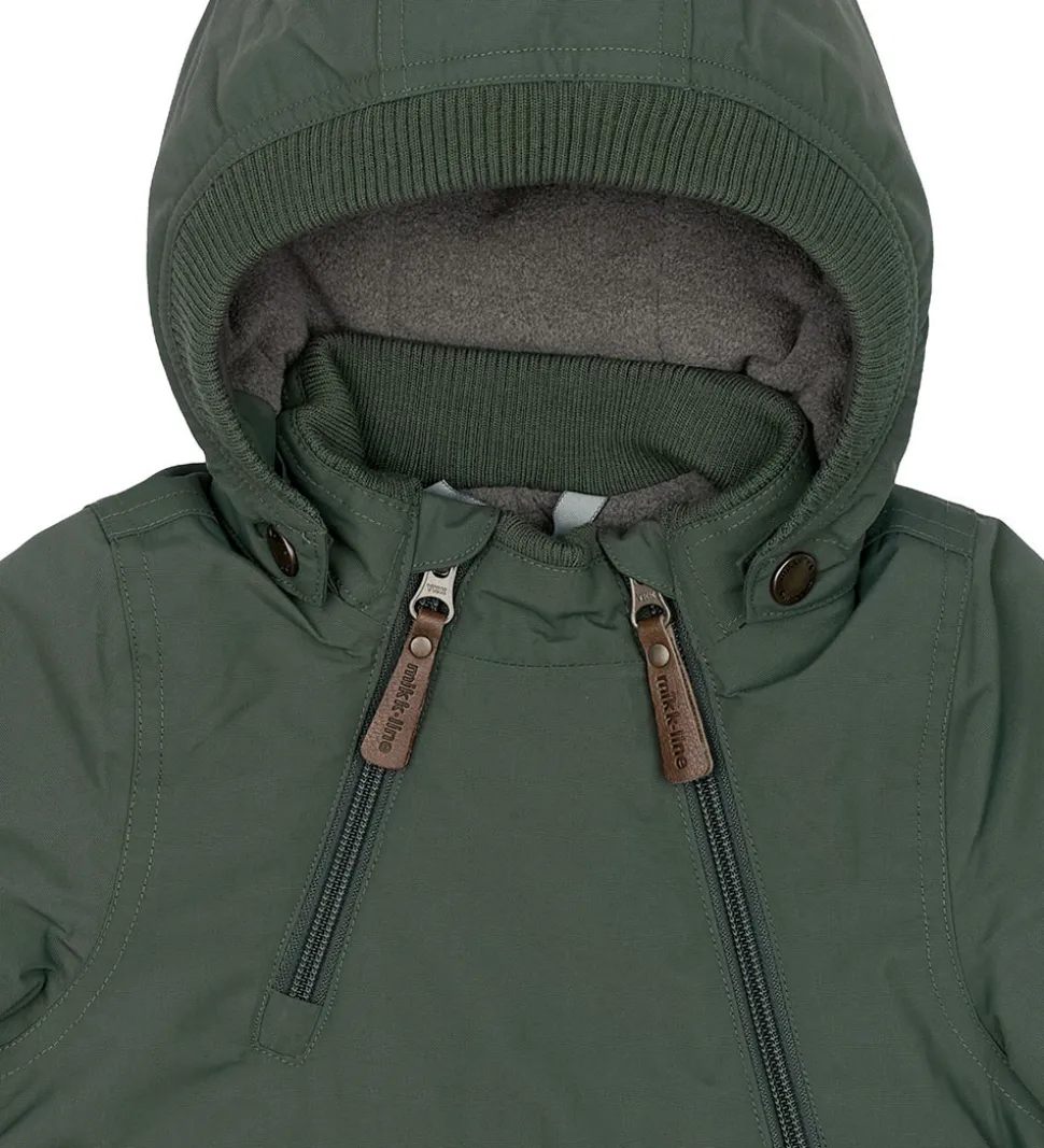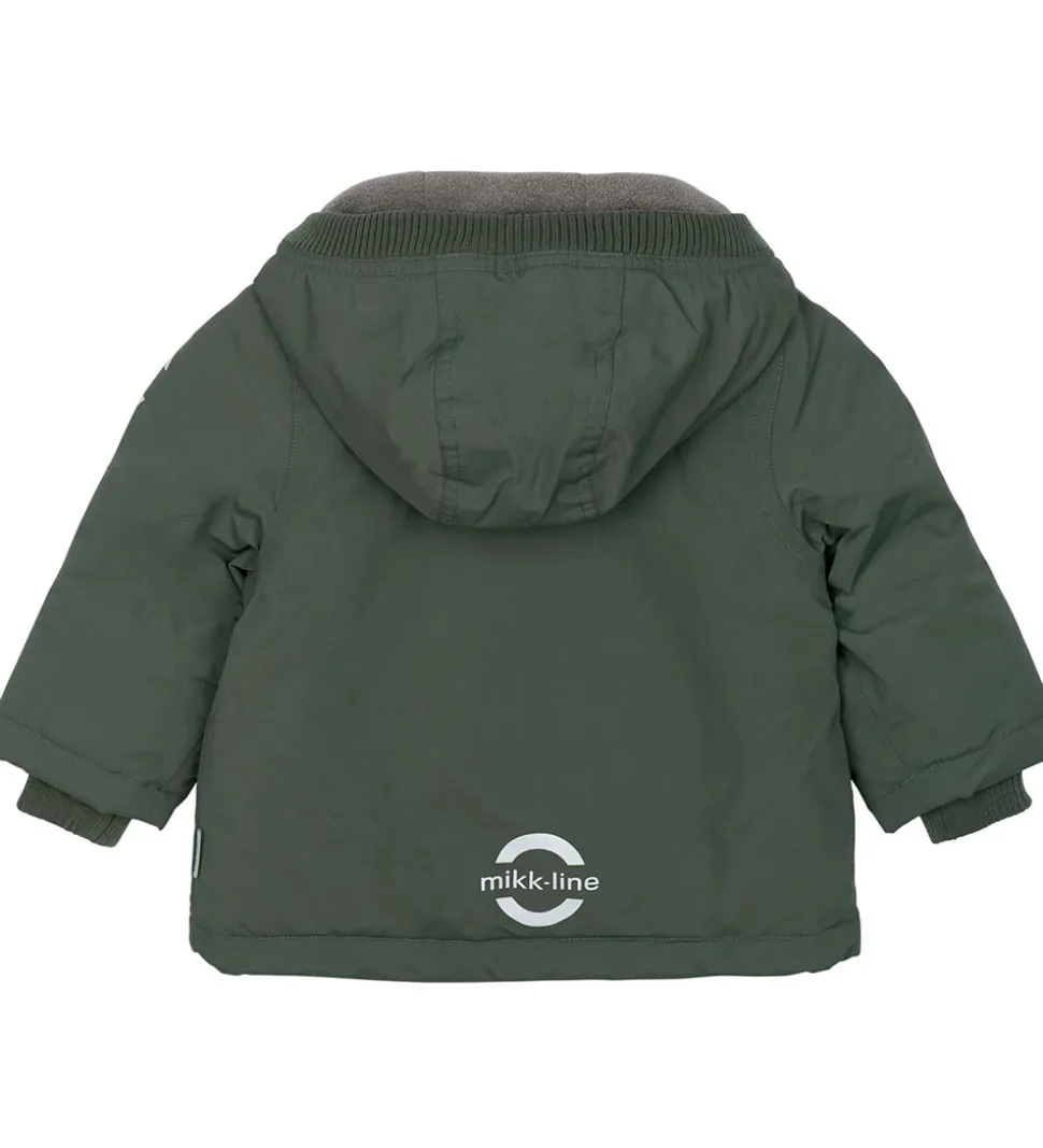 Dejlig Mikk-Line vinterjakke i mørkegrøn med refleksdetaljer på venstre ærme og nederst på ryggen.