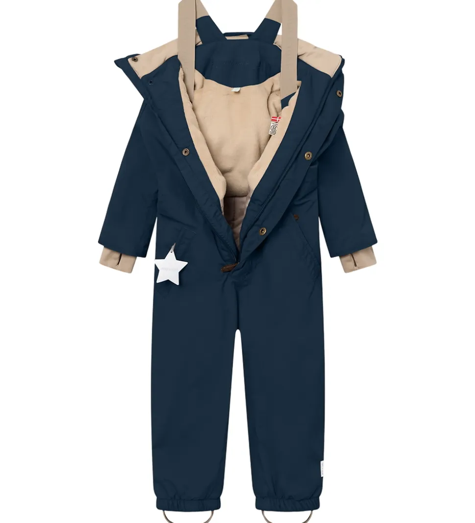 Lækker Mini A Ture flyverdragt i navyblå. Flyverdragten er med beige for.