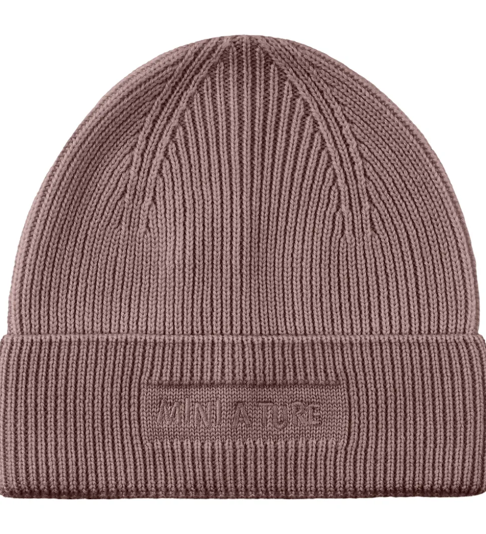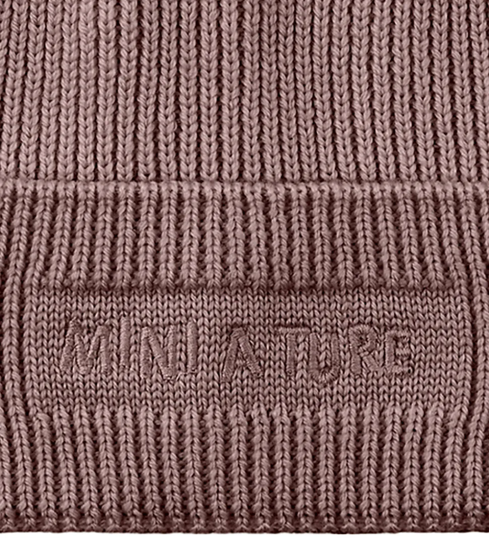 Dejlig Mini A Ture hue strikket i mat, mørk blommelilla med et diskret logo broderet på fronten.