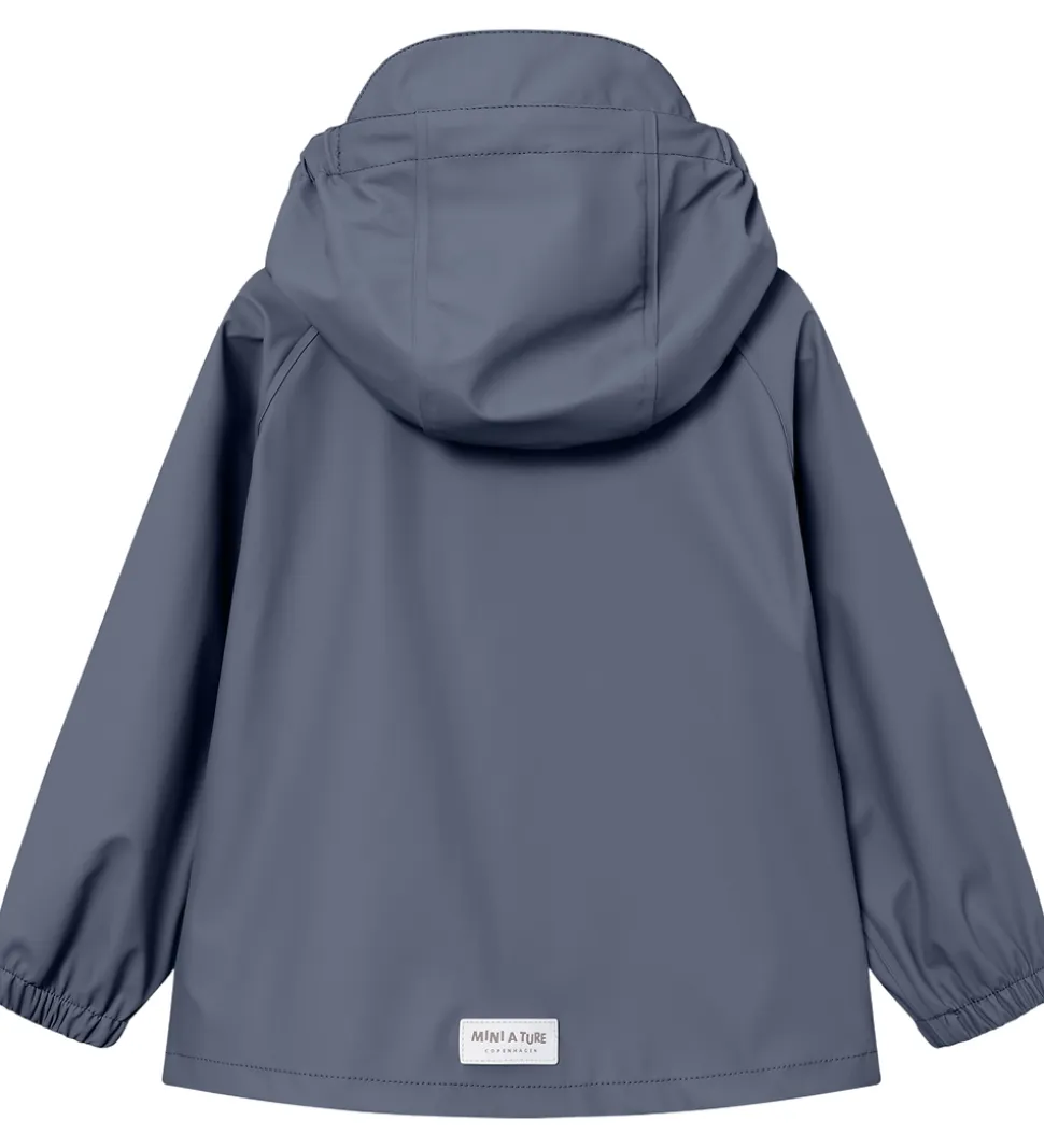 Mini A Ture regnjakken har en aftagelig hætte, der sidder fast med trykknapper, og den har en lille skygge, som skærmer for vind og vejr. Ærmerne har smalle elastikkanter, og den åbnes med en lynlås med hagebeskytter og dobbelt vindstolpe, som lukkes på ydersiden med trykknapper. I siderne er der praktiske lommer med en foldelukning.