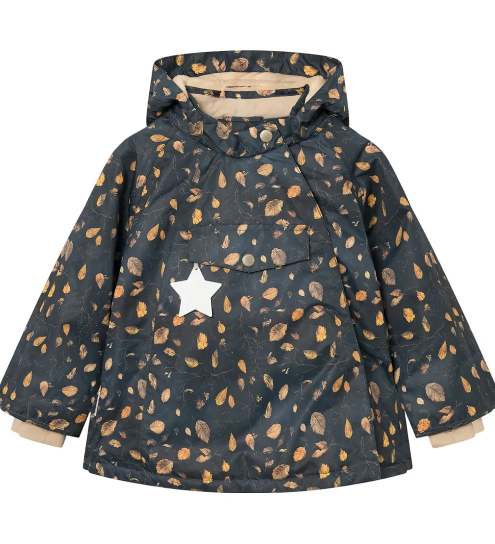 Dejlig Mini A Ture vinterjakke i mørkeblå med et alloverprint af efterårsblade i gyldenbrune nuancer. Vinterjakken er med beige for.