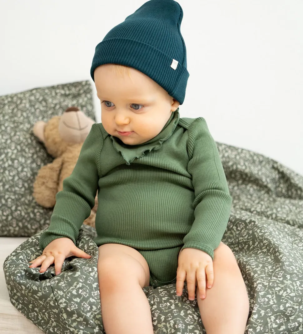 Elegant Minimalisma hue i en dyb petroleumsfarve med ribstruktur, og den er lavet af blødt merinould.. Minimalisma huen har en rund hovedform, og den består af to lag.